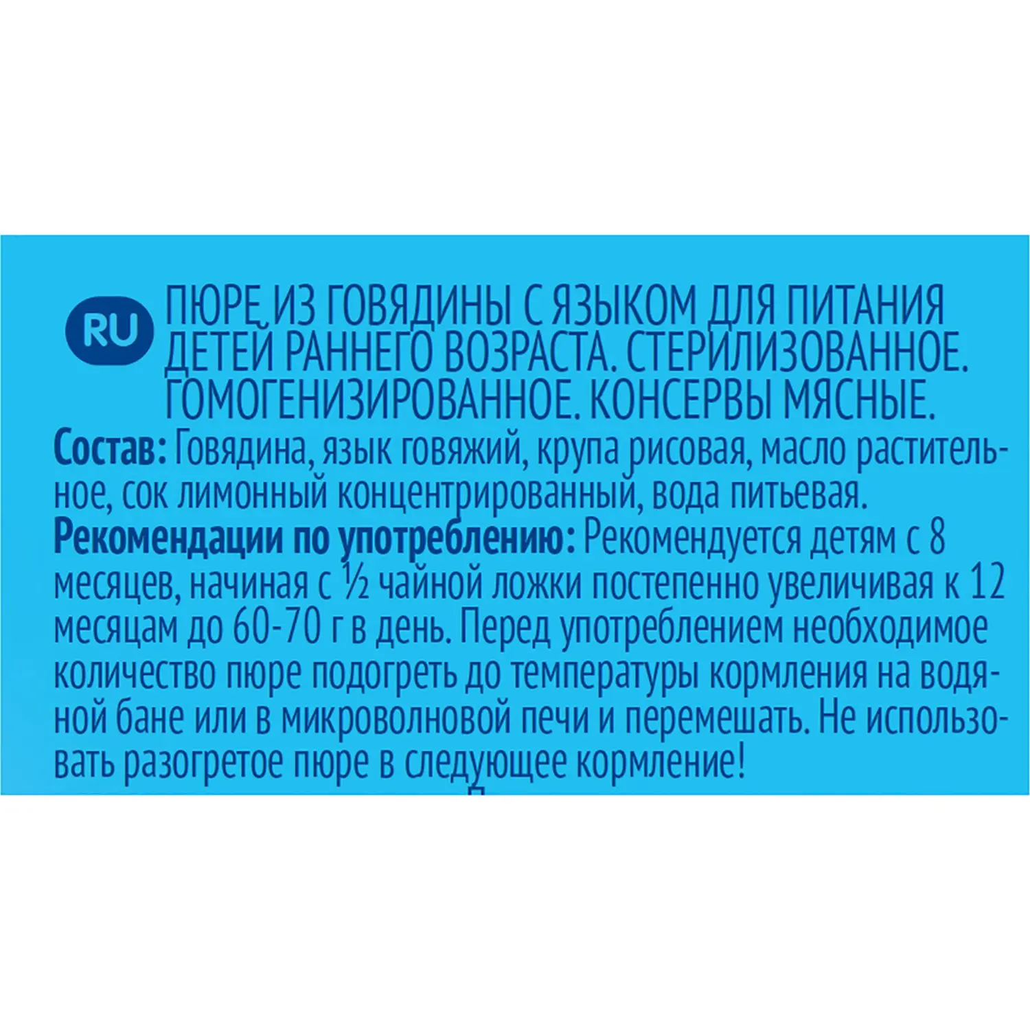 Фруктовое пюре из говядины с языком для питания детей раннего возраста. Стерилизован. Гомогенизированное. Консервированное мясо.