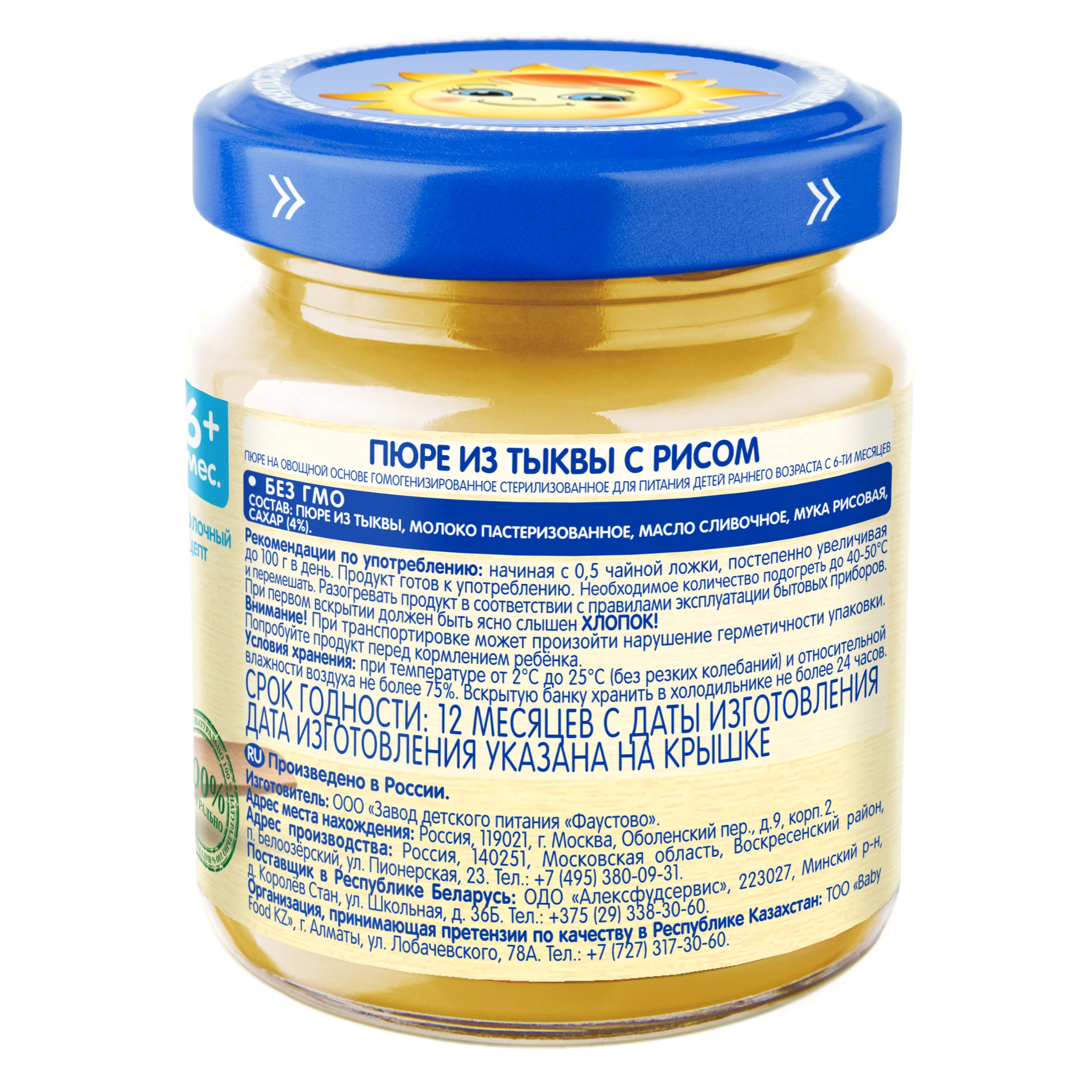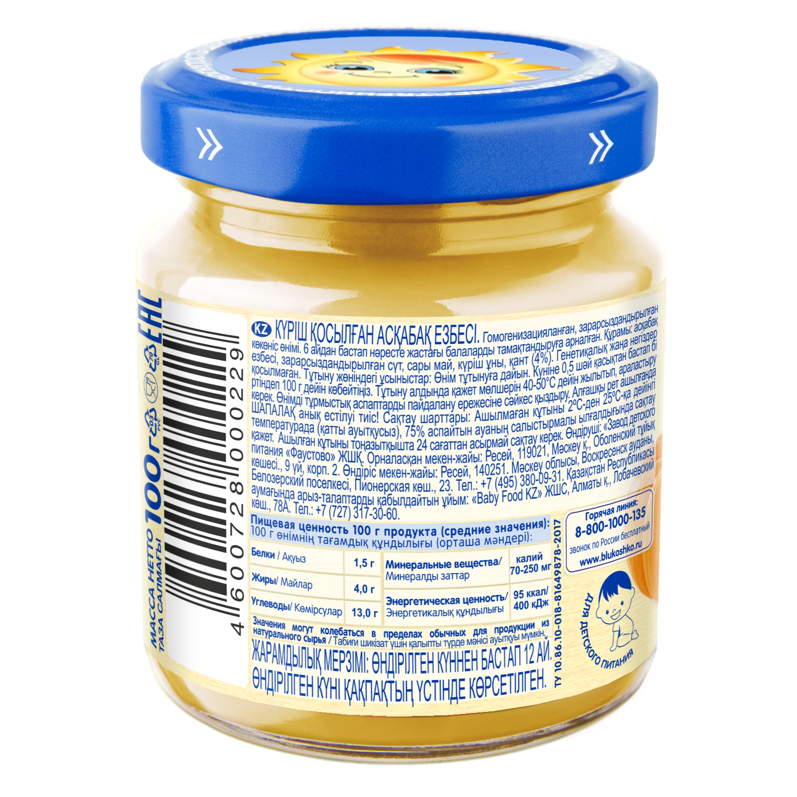 Puree babushkino lukoshko pumpkin-rice with milk for feeding children from 6 months. The absence of salt in puree corresponds to the latest recommendations of children's dietary scientists and allows you to form habits of healthy nutrition from an early age.