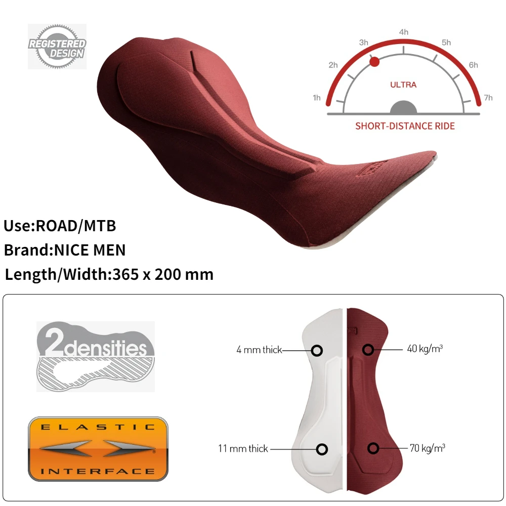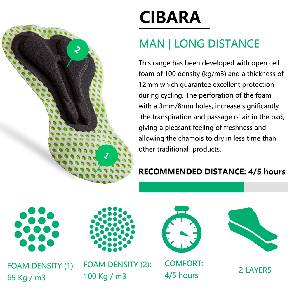 Этот диапазон был разработан с открытой клеточной пеной 100 плотности (кг/м3) и толщиной 12 мм, что гарантирует отличную защиту во время езды на велосипеде. Перфорация пены с отверстиями 3 мм/8 мм, значительно увеличивает транспирацию и прохождение воздуха в прокладке, позволяя замшу высохнуть за меньшее время, чем другие традиционные продукты.