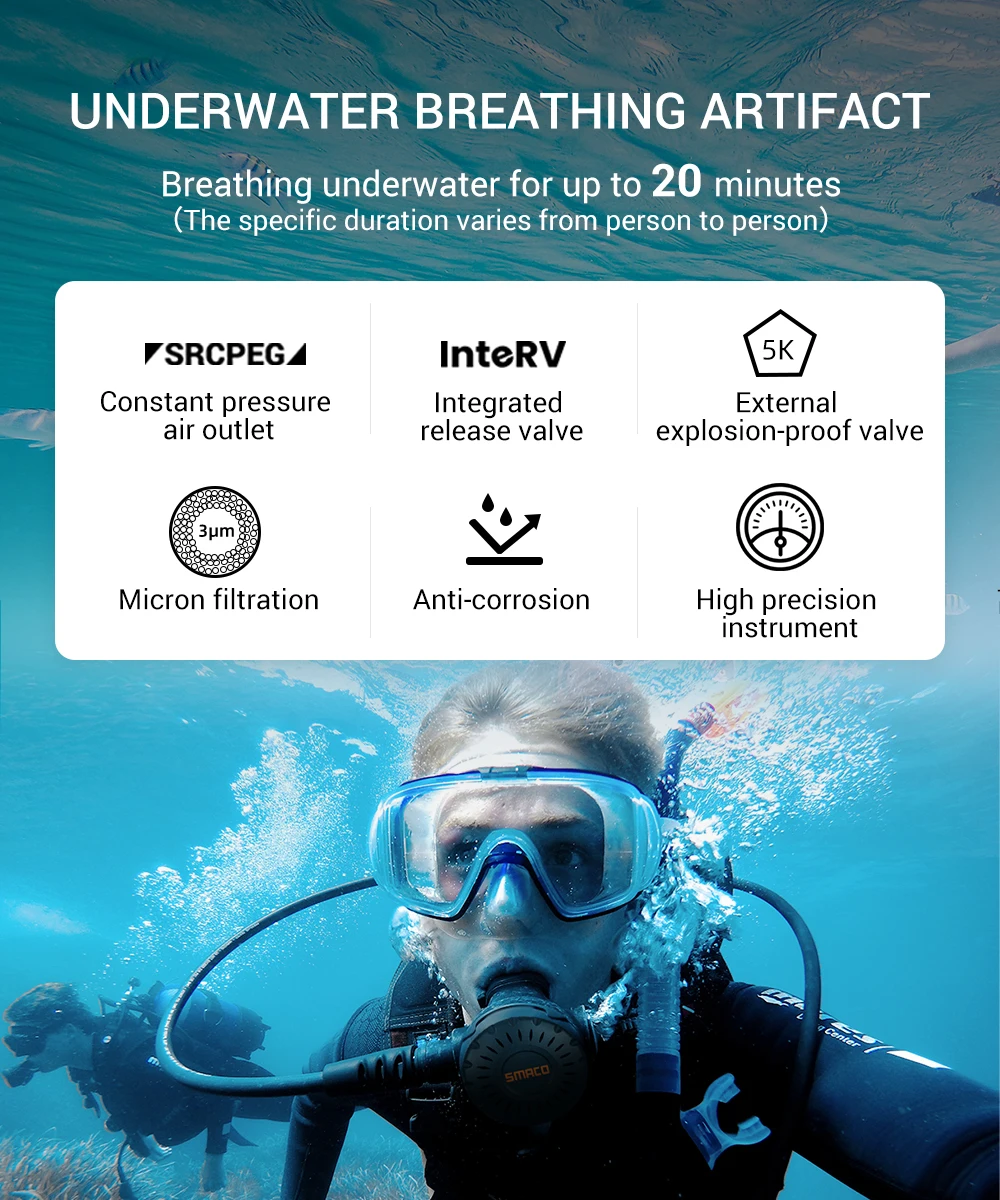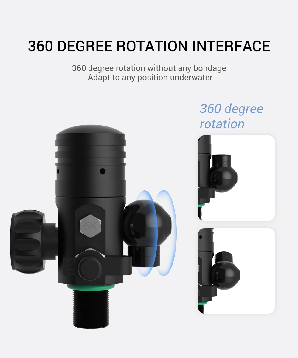Резервуар для дайвинга изготовлен из авиационного алюминия 6061, поверхность имеет технологию распыления, хранение газа высокого давления, долговечность и устойчивость к коррозии морской воды. Интегрированный отпускной клапан имеет высокую точность и высокую стабильность, три слоя фильтрации могут эффективно защитить сердечник клапана, может эффективно организовать пыль и примеси для вдыхания. Тест-спрей для дыхательной головки в течение более 300 часов, длительный срок службы и безопасность.