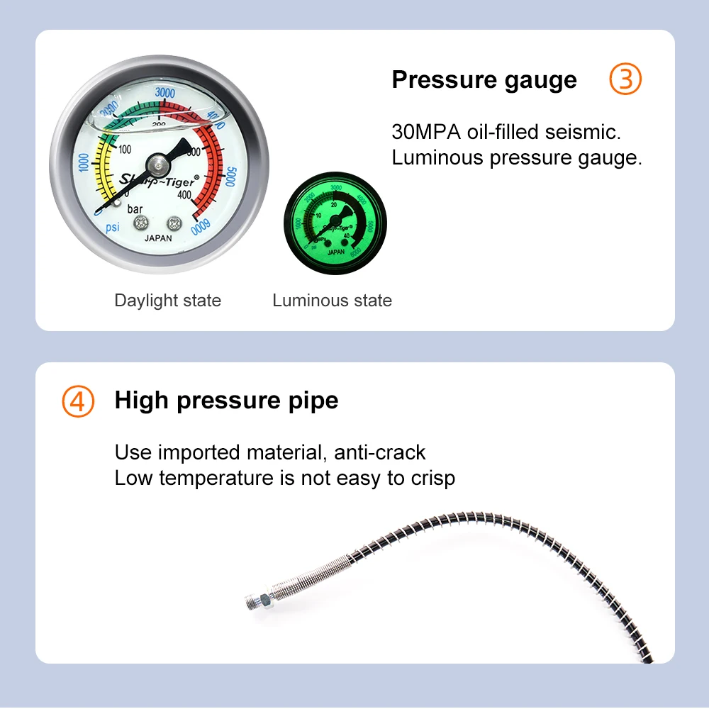 С адаптером для заправки больших флаконов, заполняйте до 8 секунд. В то же время, наша оригинальная Портативная сумка-мессенджер была заменена на портативную поясную сумку, чтобы вы могли легко носить ее с собой и освободить руки, чтобы сделать больше вещей под водой. Манометр прилагается, он изготовлен из нержавеющей стали и является водонепроницаемым, коррозионно-стойким и твердым. Он также имеет функцию подсветки, так что вы можете легко узнать, когда заполнить.