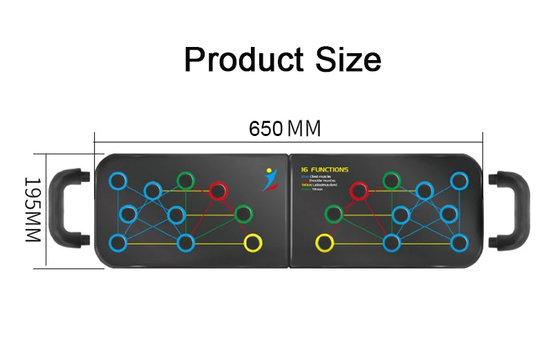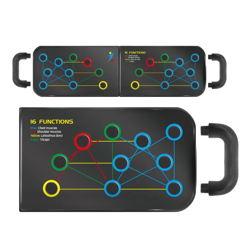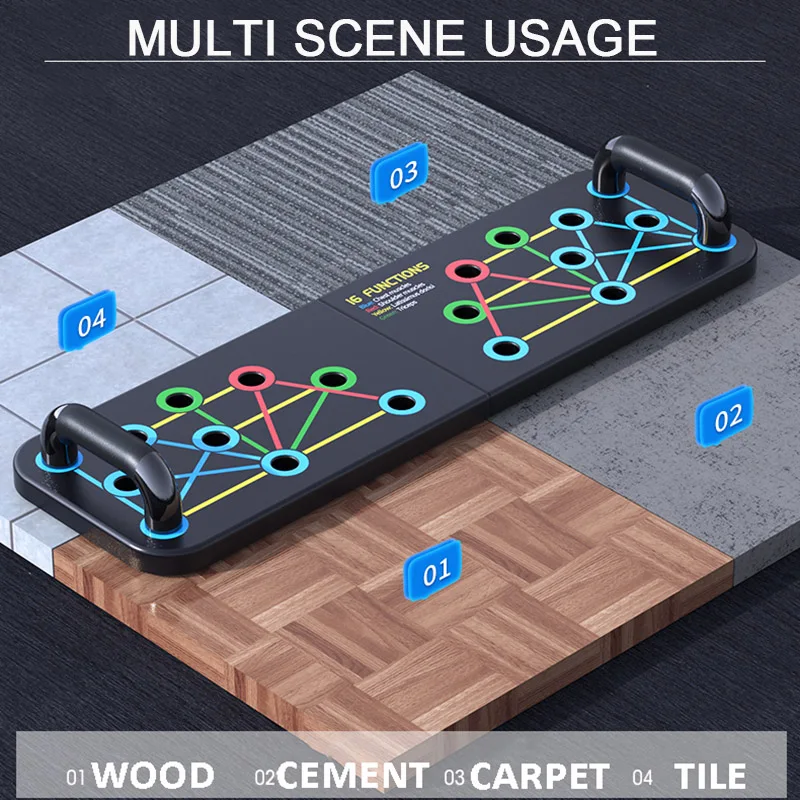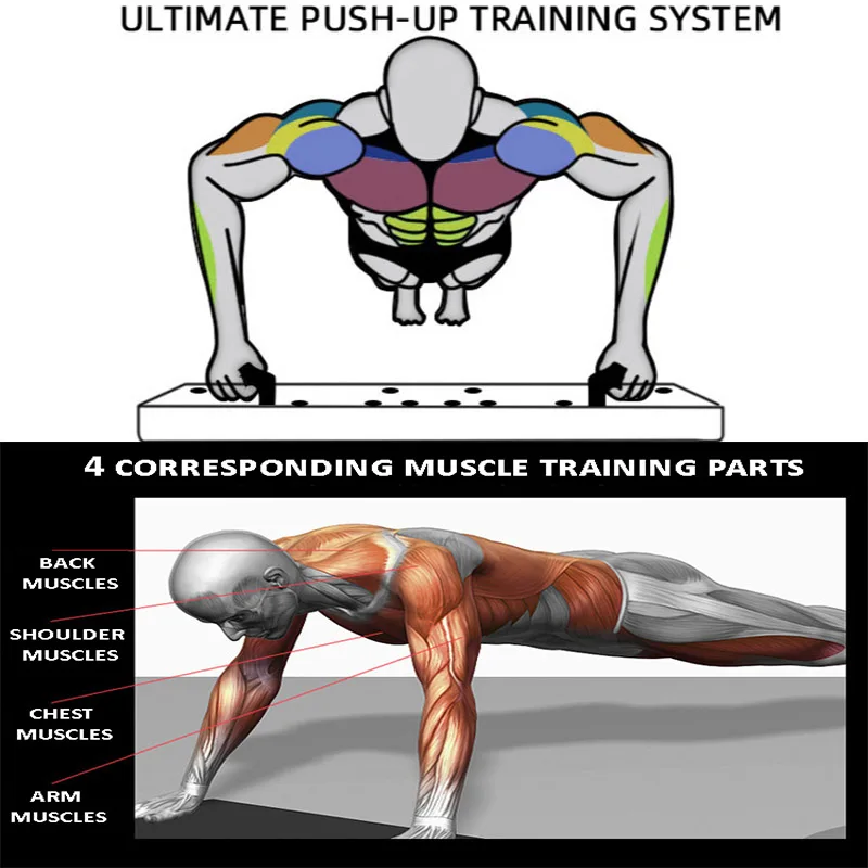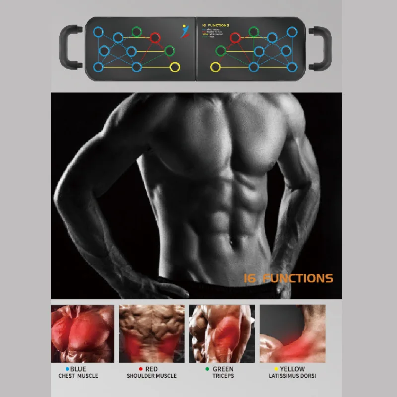 ※ Различные цвета-кодовые поджимная доска цели специфические мышцы работали (синий-грудь, красный-плечи, желтый-назад, и зеленый-трицепс)