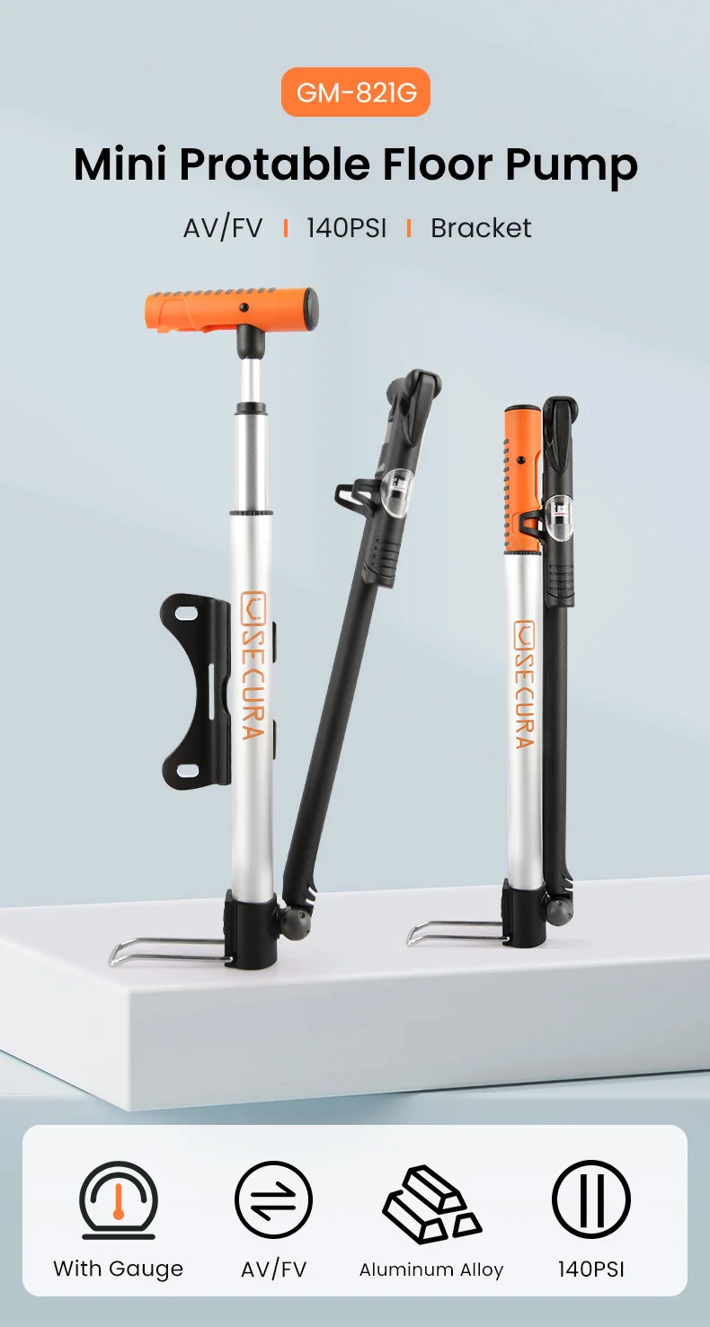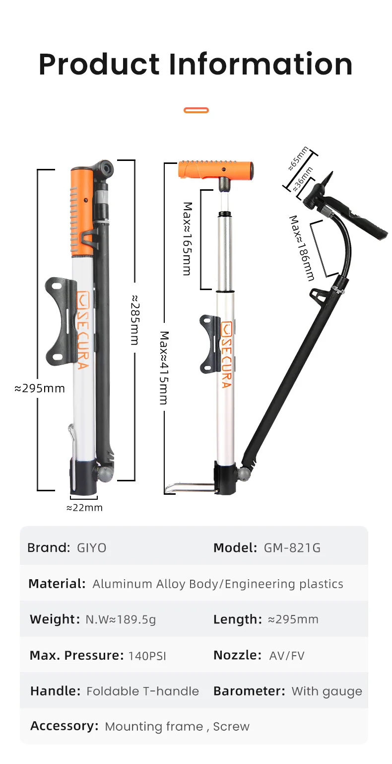 Информация о продукте:* Модель: GM-821G* Вес нетто: 187 г* Размер: 290x22 мм* Максимальное давление: 140psi* Тип: напольный* Ручка: складная t-ручка* Барометр: с манометром* Материал: корпус из алюминиевого сплава/инженерный пластикОсобенности продукта:** Высокое давление/портативный/мини** Подходит для клапана Presta / Schrader** Вращающаяся труба/Удлинительный шланг** Манометр 140psi** Складная напольная стоящая часть