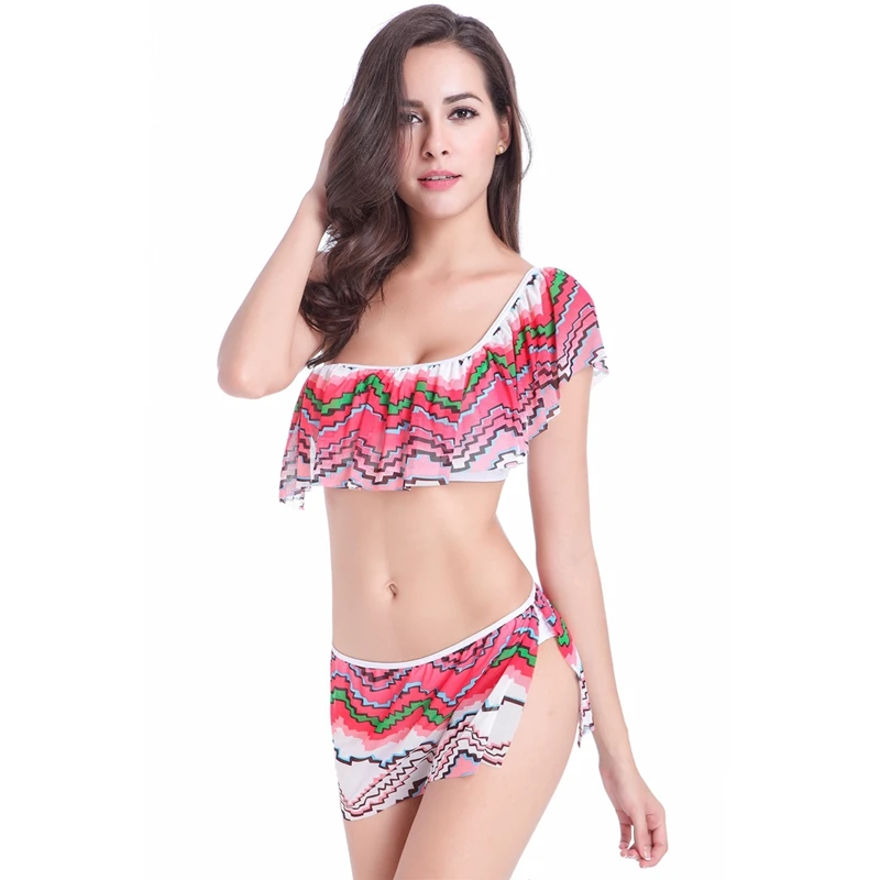 Номер товара: DM063 1. Основная ткань: 80% нейлон, 18% спандекс, 200 ГСМ 2. Сетчатый слой 3. Топ с оборками 4. Регулируемый плечевой ремень 5. Съемная подкладка пуш-ап 6. Завязывается сзади 7. Перед полностью на подкладке 8. Цвет: 4 цвета s. 9. Размер: S.M.L.XL.XXL