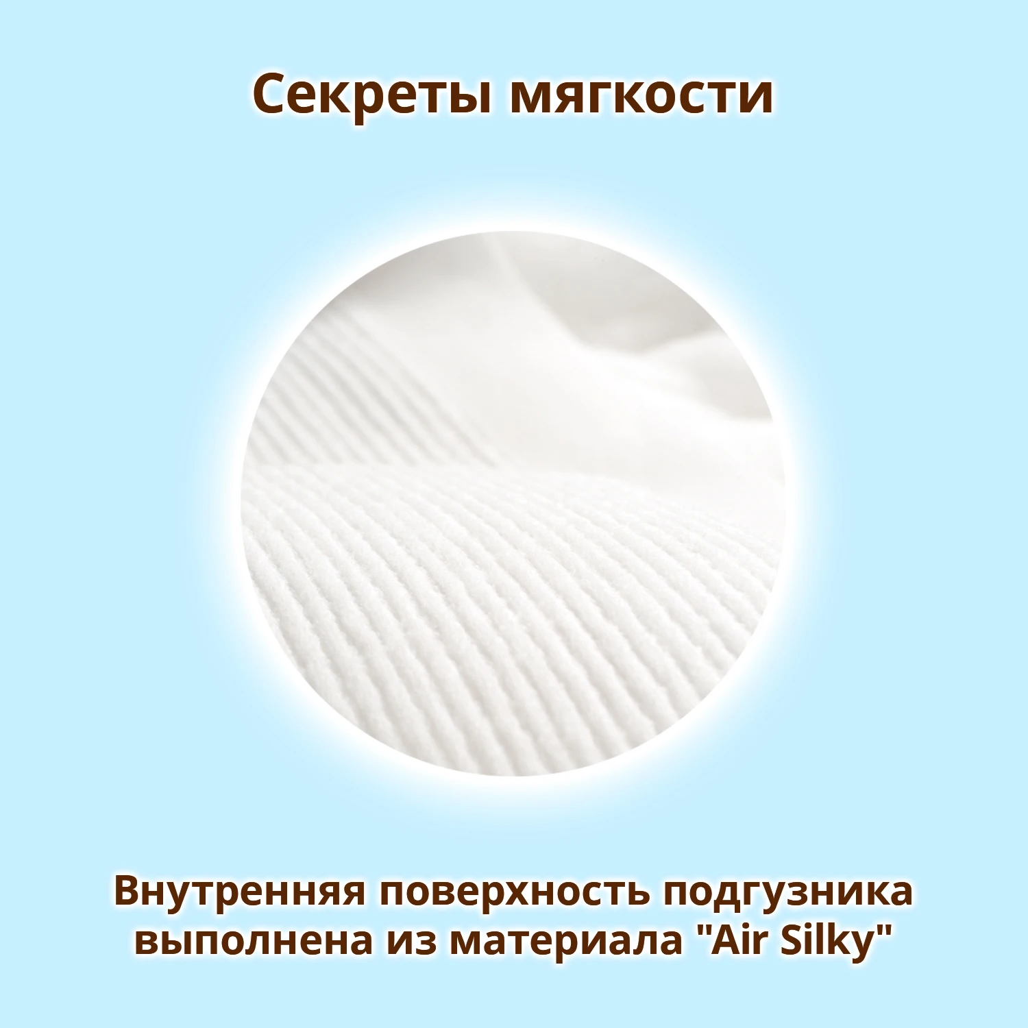 Материал подгузника «AirSilky» мягкий словно шелк! Мы сделали материал, соприкасающийся с нежной кожей ребенка, мягким и приятным на ощупь. Тщательно проработанная конструкция подгузников отвечает потребностям растущего малыша.