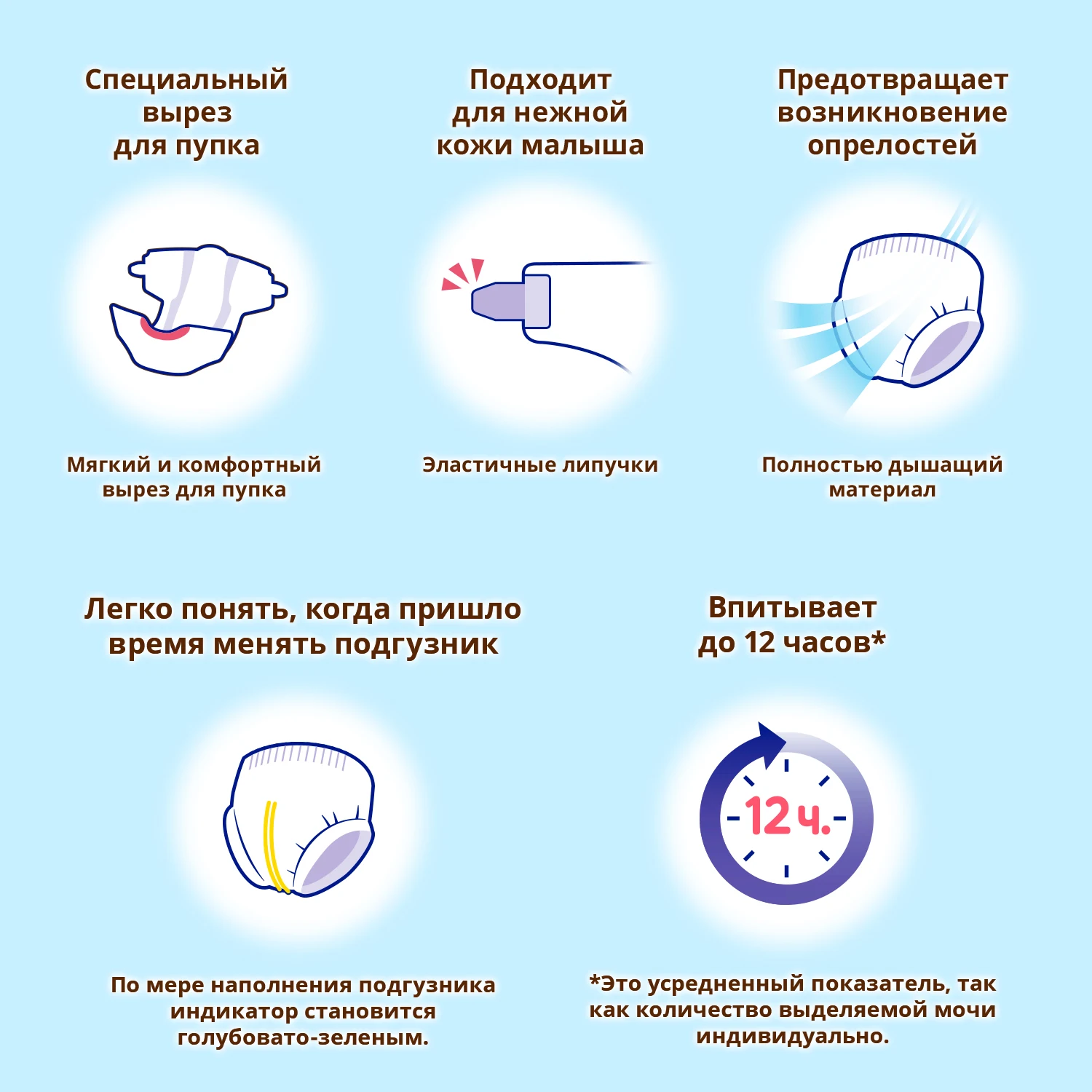 5. Дышащие подгузники moony впитывают до 12 часов**. В конструкции подгузника предусмотрена специальная вставка для пупка и эластичный пояс, а также индикатор наполняемости.
