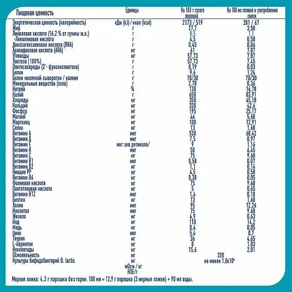 сыворотка молочная деминерализованная, обезжиренное молоко, растительные масла (подсолнечное высокоолеиновое, кокосовое, соевое, масло из Мортиереллы Альпины), лактоза, рыбий жир, кальция нитрат, гидроксид калия, цитрат калия, цитрат калия, минералы (сульфат железа, сульфат цинка, сульфат меди), витаминно-минеральный премикс (L-аскорбат натрия (С), DL-альфа-токоферол ацетат (Е), никотинамид (РР), кальция D- пантотенат (В5), тиамин мононитрат (В1), рибофлавин (В2), ретинола ацетат (А), пиридоксин гидрохлорид (В6), сульфат марганца, йодид калия, фолиевая кислота (В9), селенат натрия, филлохинон (К),D3 холекальциферол (Д), Д-биотин (В7), цианкобаламин (В12), инозит, таурин) хлорид магния, олигосахариды 2"FL, эмульгатор соевый лецитин, хлорид калия, регулятор кислотности лимонная кислота, L-фенилаланин, фосфат натрия, культура бифидобактерий лактис (не менее 1х10^6 КОЕ/г), хлорид натрия, гидроксид кальция, нуклеотиды, L-гистидин, L-карнитин, сывороточный белок. |