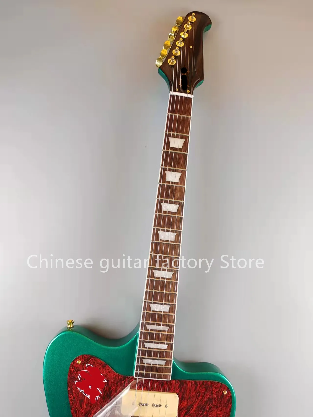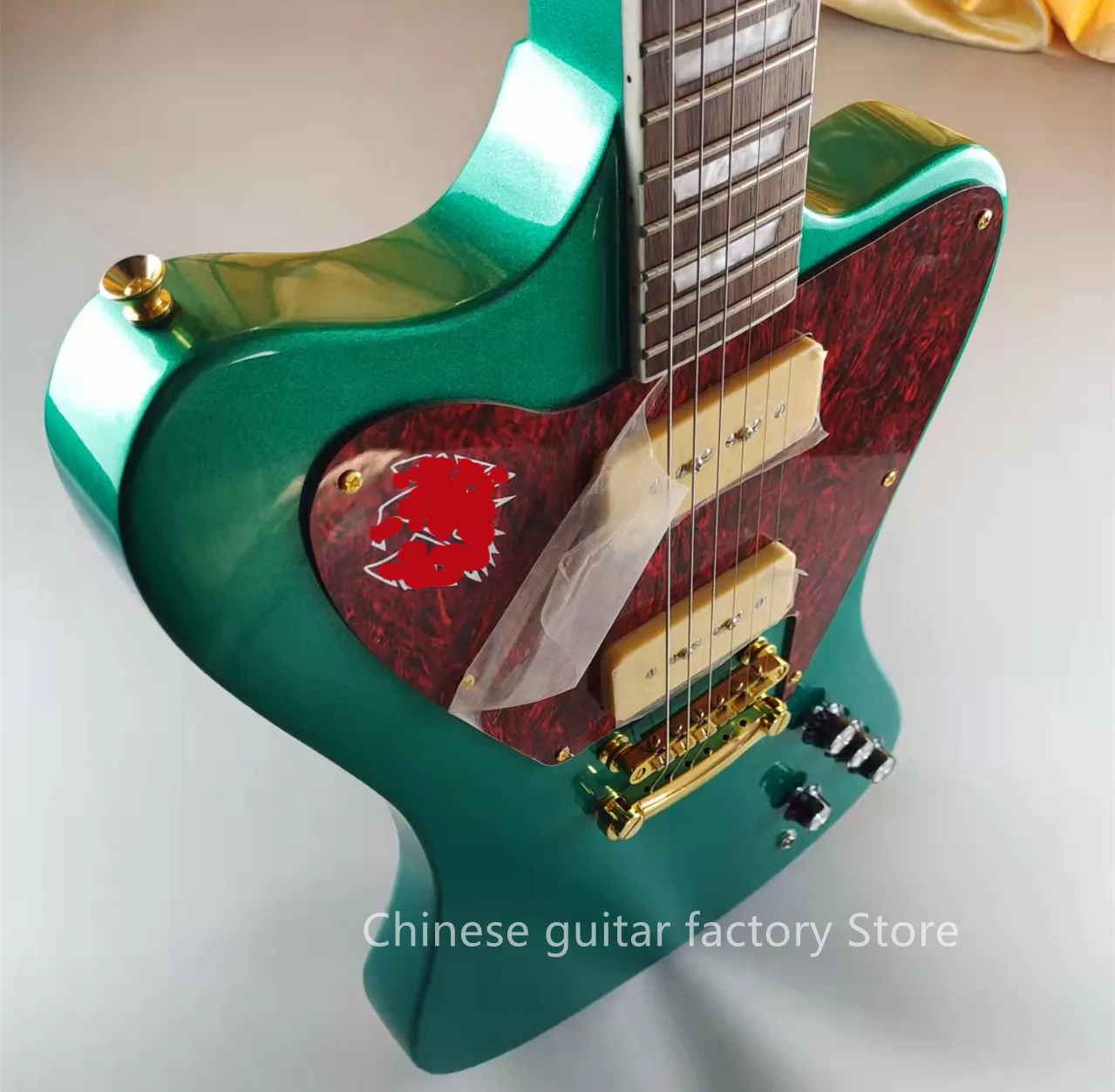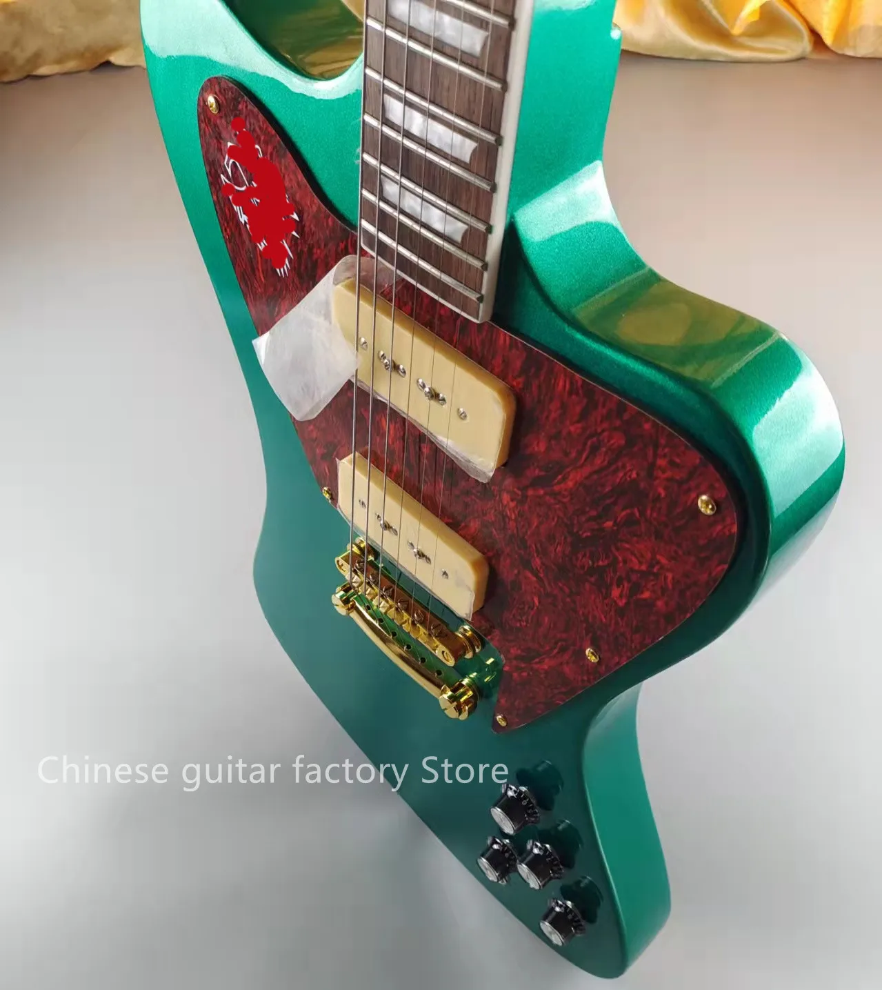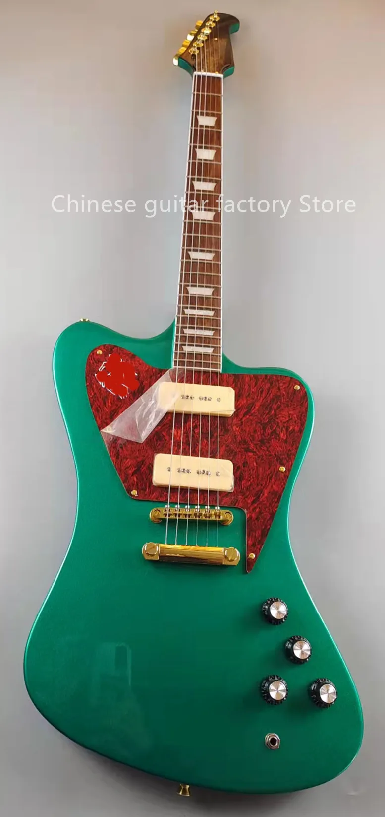 Электрическая гитара Firebird, серебристо-зеленые вспышки, золотые аксессуары, пикапы P90, корпус из красного дерева, продается в наличии, бесплатная доставка, быстрая доставка