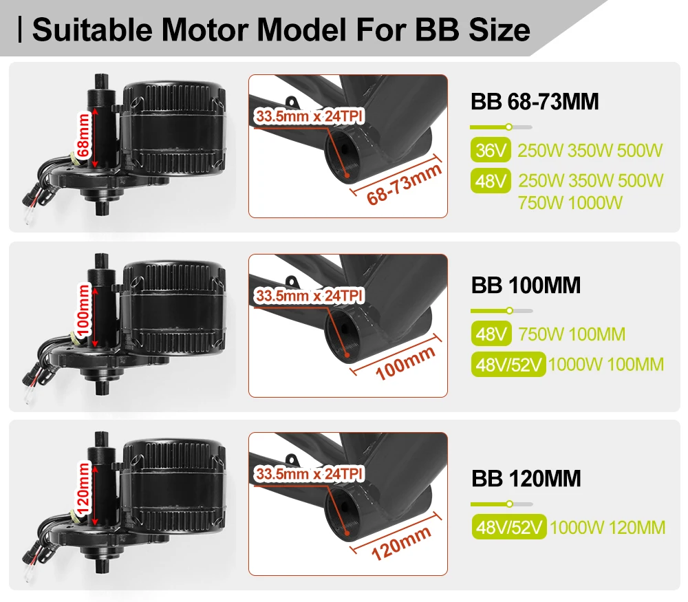 О: Этот двигатель среднего привода подходит для велосипеда с широким нижним кронштейном 68 мм (2,68 дюйма) - 73 мм (2,87 дюйма). Внутренний диаметр кронштейна должен быть не менее 33,5 мм. Мы отправим дополнительные аксессуары для установки для нижнего кронштейна 73 мм.