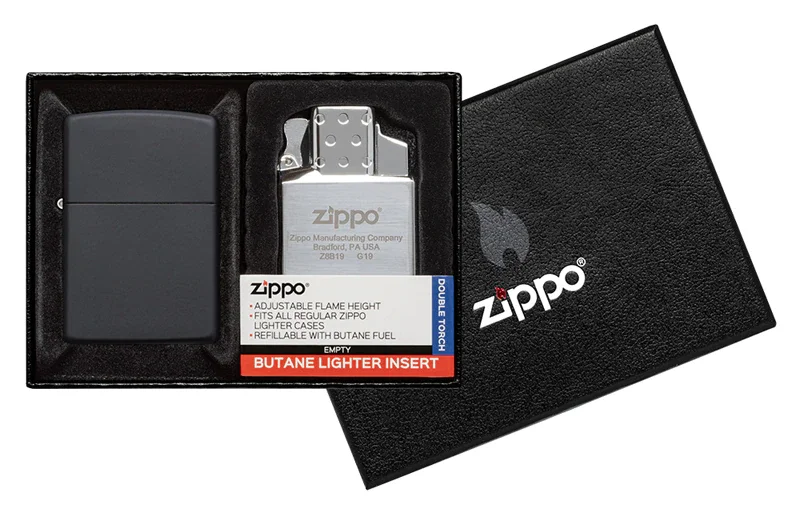 Впервые и по многочисленным просьбам клиентов Zippo предлагает новый подарочный набор, включающий в себя популярную классическую зажигалку Black Matte и газовый вставной блок с двойным пламенем.