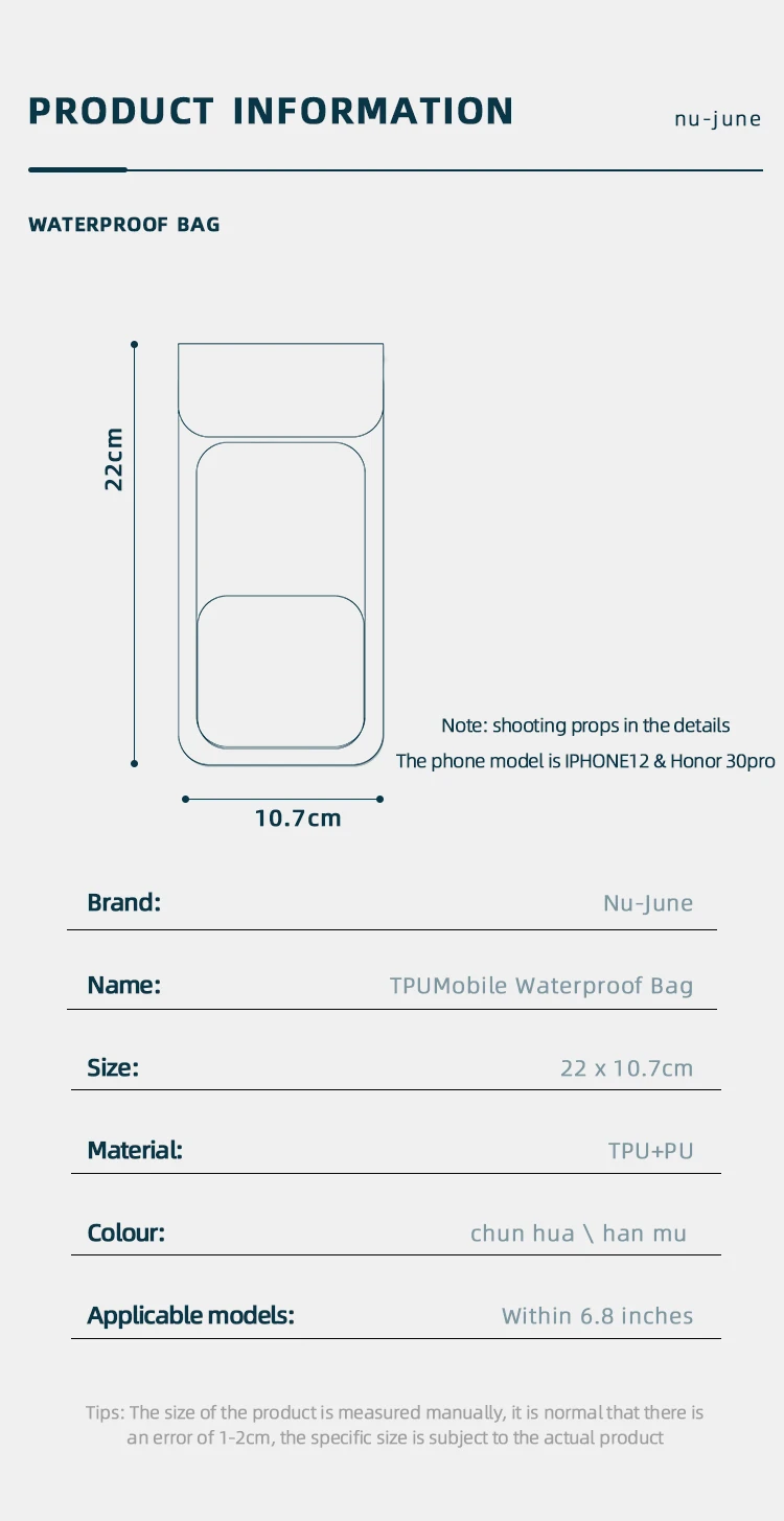 Nu-June Mobie Phone Swim ming Bag водонепроницаемый чехол для телефона из ТПУ с сенсорным экраном подводный чехол для телефона для плавания, дайвинга, пляжа