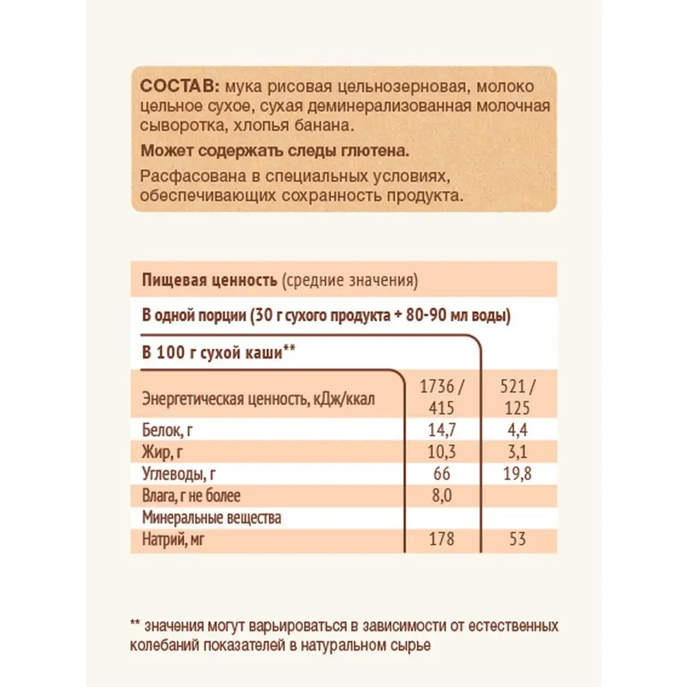 Состав: Мука рисовая цельнозерновая, молоко цельное сухое, сухая деминерализованная молочная сыворотка, хлопья банана. Может содержать следы глютена.