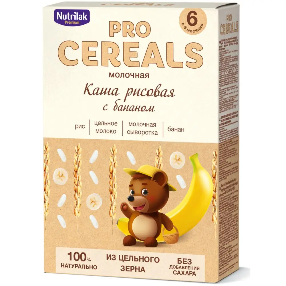 Нутрилак Премиум - каша мол. цельнозерновая "Рисовая с бананом PROCEREALS".Молочные цельнозерновые каши РROCEREALS приготовлены из отборного цельного зерна, цельного молока, молочной сыворотки и фруктовых хлопьев. Цельное зерно состоит из зерновой оболочки, зародыша и сердцевины. Сохраняя природную ценность, цельное зерно является источником углеводов, растительного белка, пищевых волокон, витаминов и минеральных веществ. Каши из такого зерна не нужно обогащать дополнительно. Цельное молоко повышает питательную ценность каши, являясь источником высококачественного молочного белка и витаминов. Молочная сыворотка регулирует соотношение между казеином и сывороточным белком по составу, придавая натуральную сладость каше. Фруктовые хлопья знакомят малыша с новыми ощущениями, расширяя вкусовую палитру малыша. НИЧЕГО ЛИШНЕГО. ПРОСТО ПОЛЕЗНО.