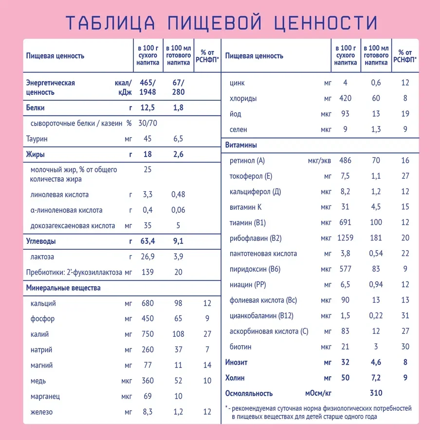 В состав смеси входят Омега-3 (DHA) особые жирные кислоты, необходимые для формирования мозга, нейронных связей и сетчатки глаз.
