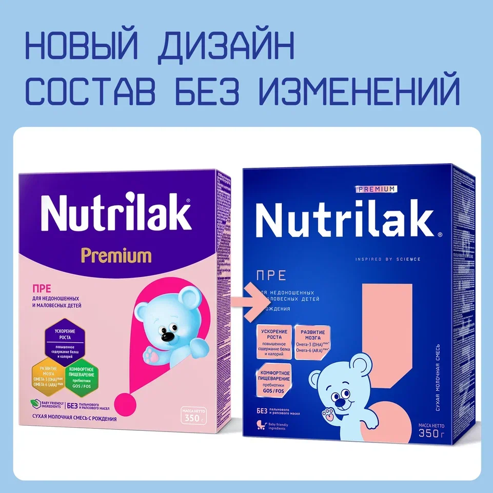 Смесь молочная сухая для недоношенных и маловесных детей «Нутрилак (Nutrilak) Premium ПРЕ» Для недоношенных и маловесных детей. Детская молочная сухая смесь с повышенным содержанием белка с максимальным преобладанием сывороточных белков и жира с включением среднецепочечных триглицеридов СЦТ, сниженным содержанием лактозы и повышенной калорийностью для обеспечения догоняющего роста по сравнению со стандартными смесями.