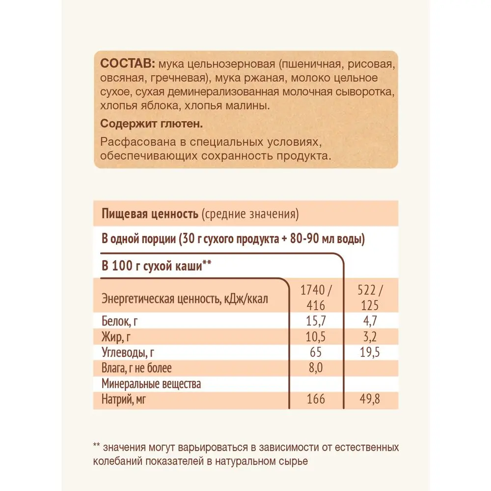 Состав: мука цельнозерновая (пшеничная, рисовая, овсяная, гречневая), мука ржаная, молоко цельное сухое, сухая деминерализованная молочная сыворотка, хлопья яблока, хлопья малины. Содержит глютен.