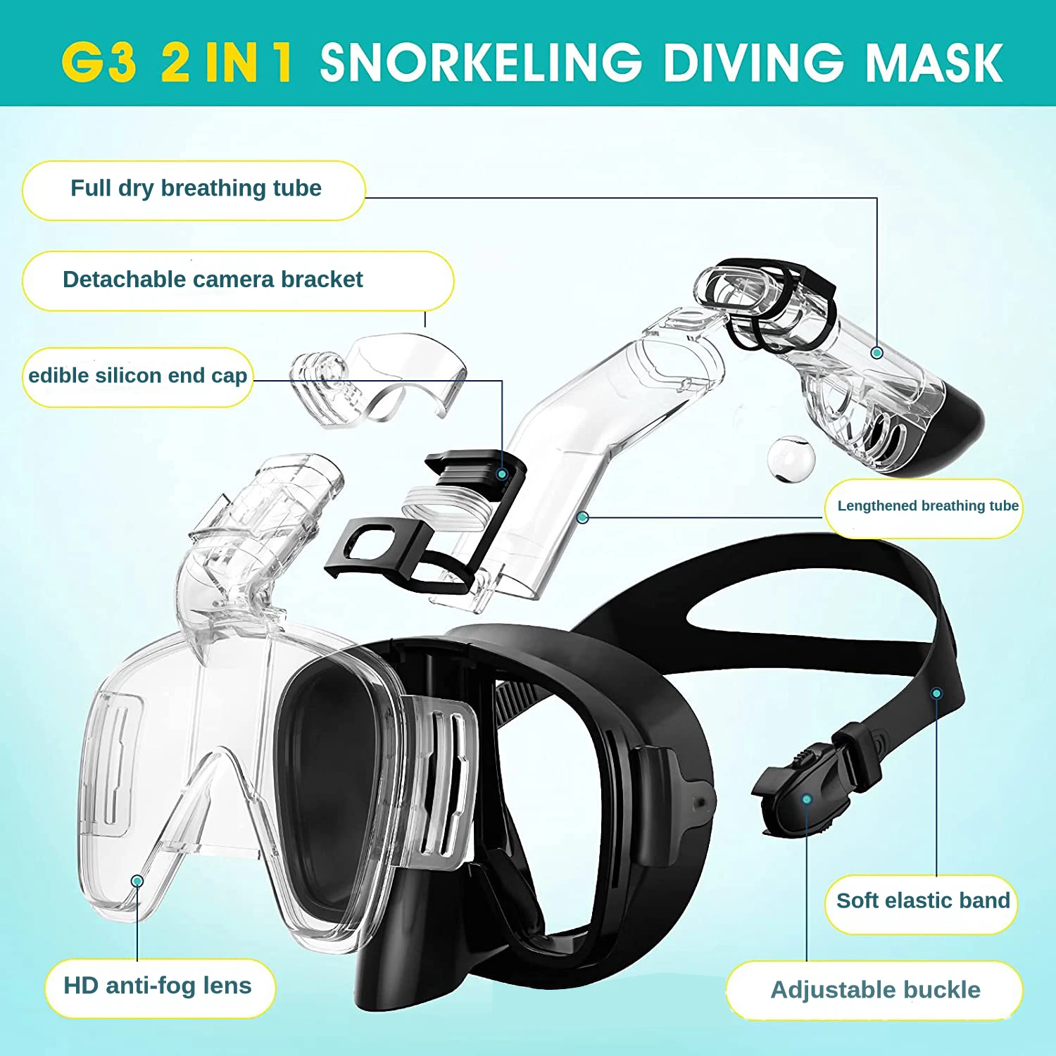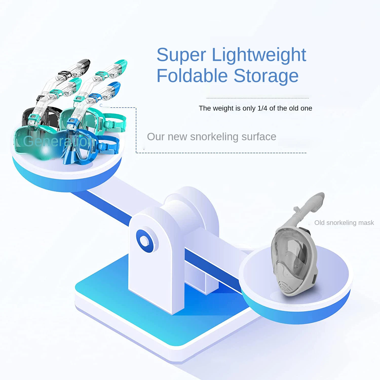 Регулируемый эластичный пояс с двойным ремешком делают его легко носить и снимать. Также лучше всего подходит для начинающих; Один размер подходит для всех различных форм лица. В дыхательная трубка Съемная складная, имеет упаковка весом всего 391 г, очень удобно хранить и переносить.