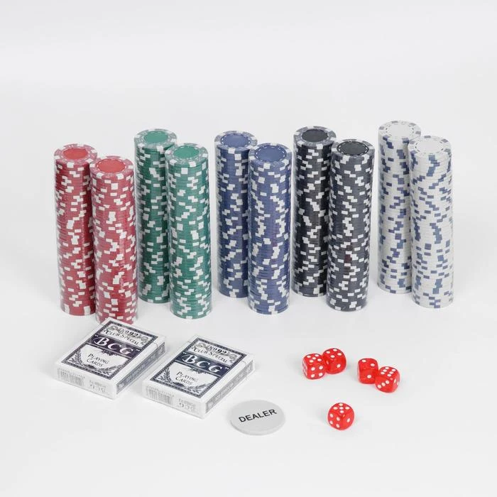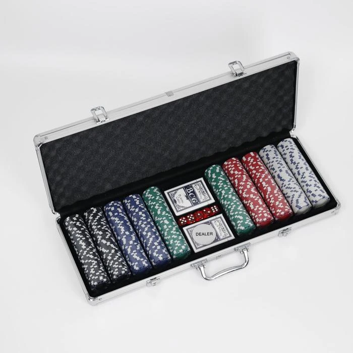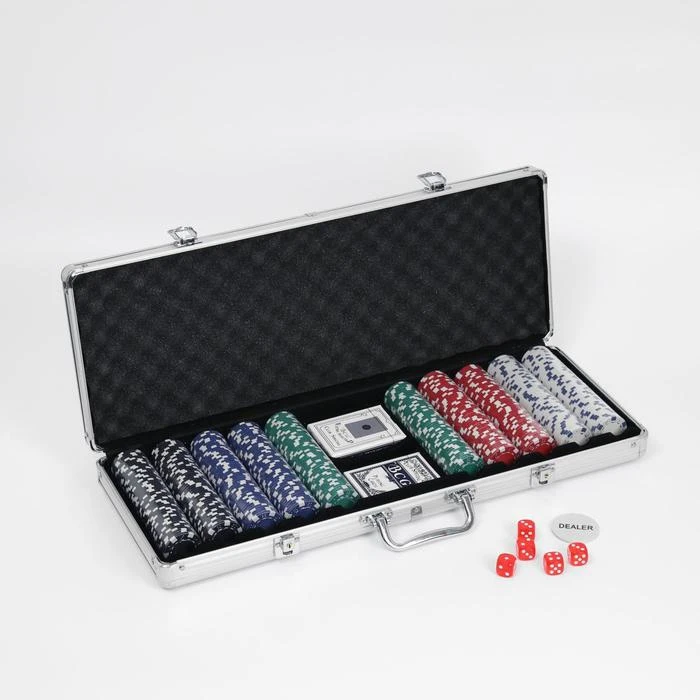 Покер в металлическом кейсе (карты 2 колоды, фишки 500 шт, 5 кубиков), 20.5х56 см