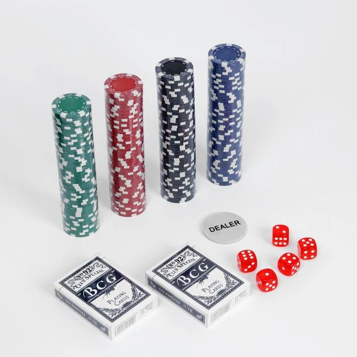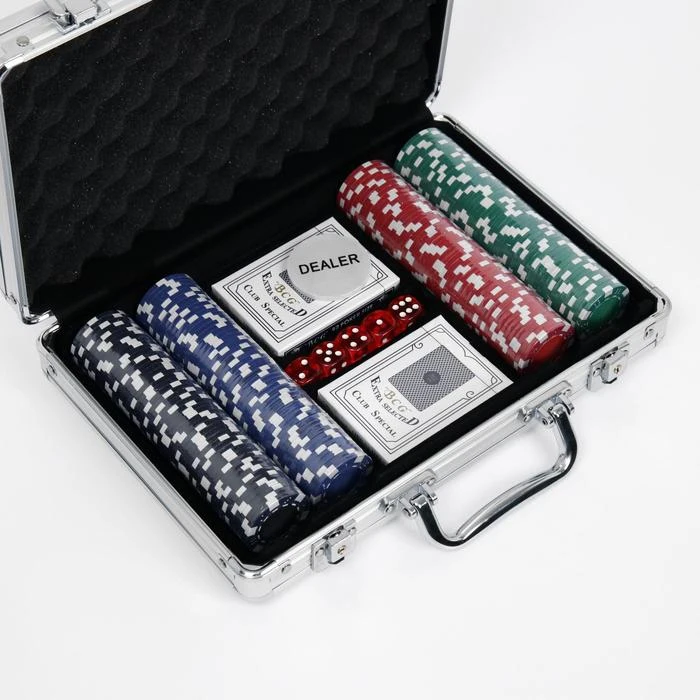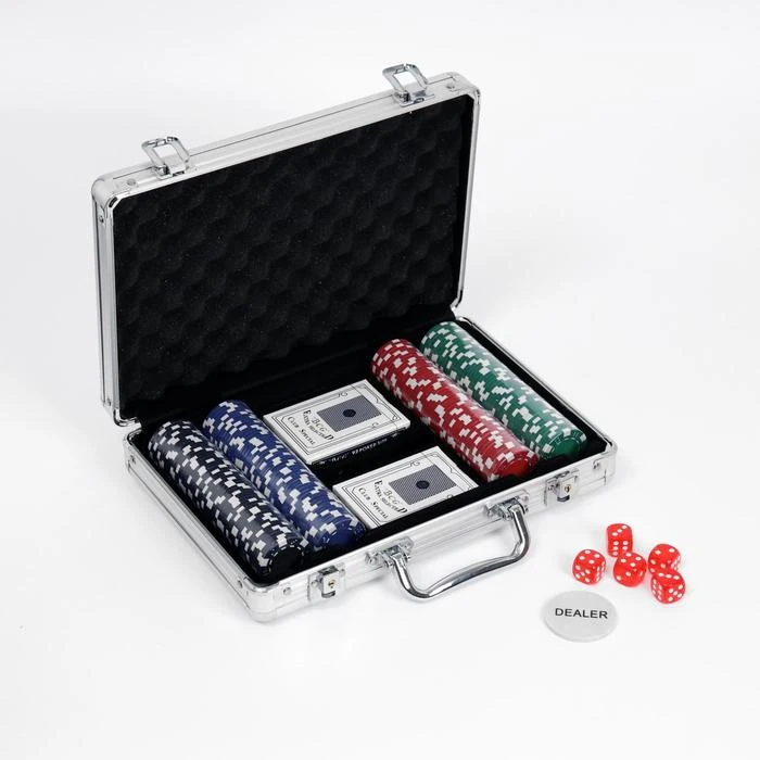 Покер в металлическом кейсе (карты 2 колоды, фишки 200 шт б/номинала, 5 кубиков), 20.5х29 см 278722
