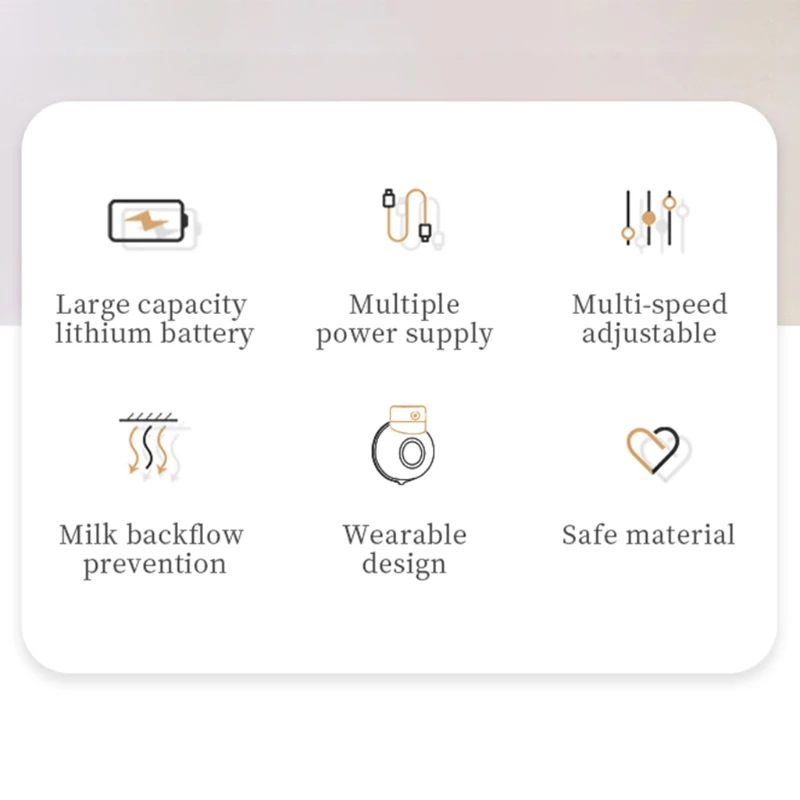Безопасный материал: Все детали молокоотсоса изготовлены из пищевого силикона PP (без BPA) и без вредных веществ. Не беспокойтесь о возможных химических веществах, попадающих в грудное молоко матери. Поэтому вы можете быть уверены, что грудное молоко будет на 100% безопасно для вашего ребенка.