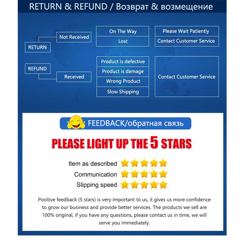 Пожалуйста, свяжитесь со мной по сообщению, прежде чем оставлять плохие отзывы, если товар не удовлетворит Вас, дайте нам знать, и мы сможем решить эту проблему. Поверьте мне, пожалуйста.
