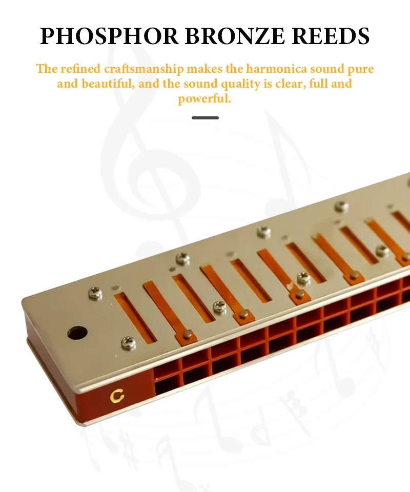 Материал: ФОСФОРНЫЕ бронзовые трости с сварной, Латунные плиты с гальваническим покрытием, латунные крышки с гальваническим покрытием, ABS гребень. Вы будете чувствовать себя комфортно во время игры, легко использовать навыки, такие как чрезмерное выдувание и изгиб, давая артисту новый опыт.
