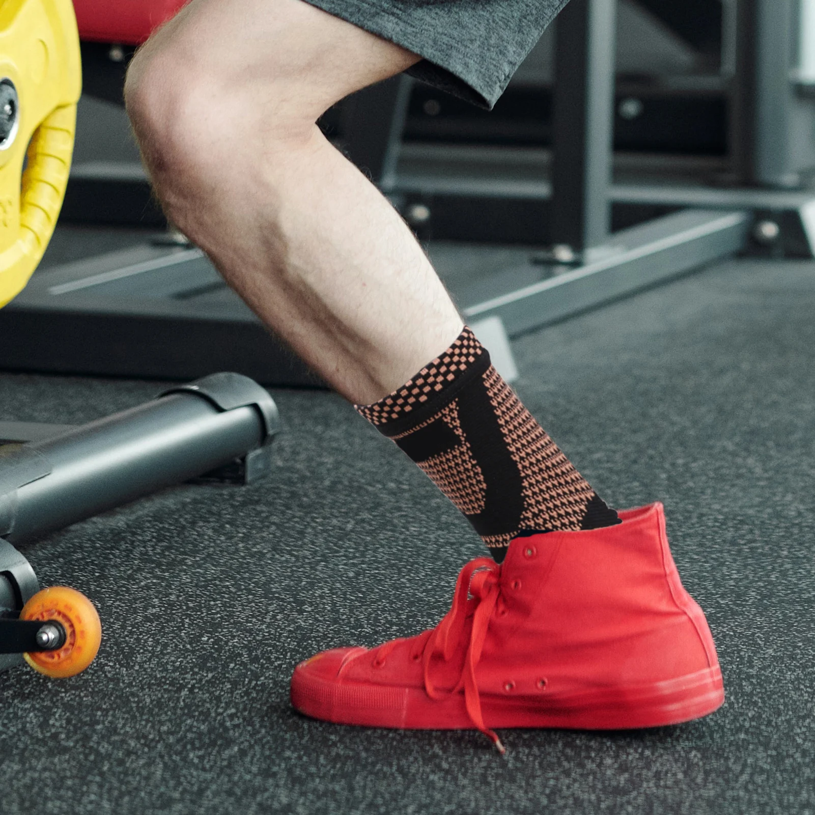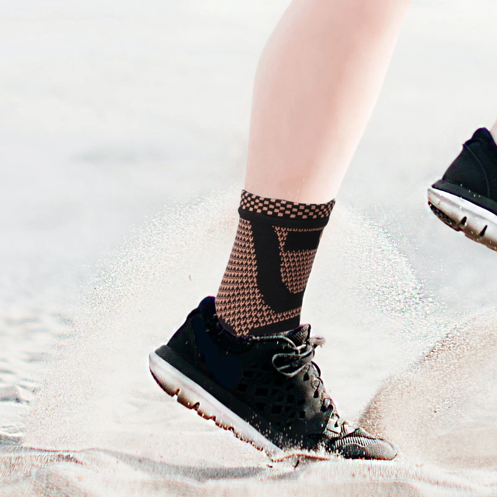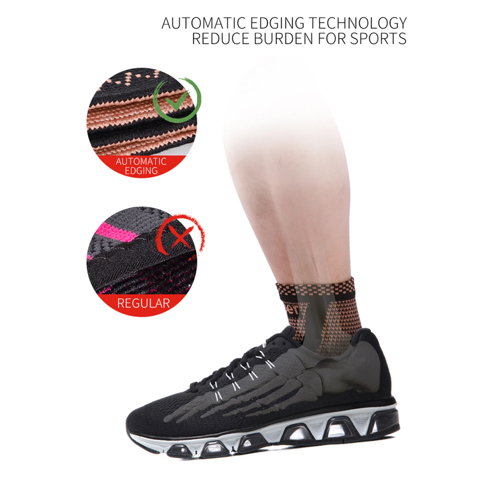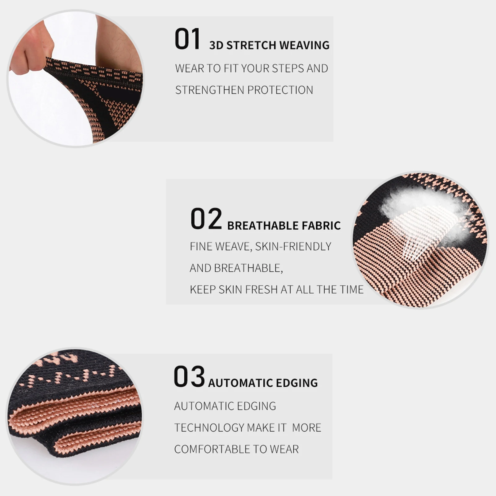 Наш компрессионный бандаж для лодыжки из меди изготовлен из высококачественного нейлона и спандекса, которые пропускают воздух и впитывают пот. Это может помочь выздоровлению, облегчить боль и уменьшить возникновение травм и воспламенения. Подходит для людей, страдающих подошвенным фасциитом, мышечной усталостью или суставами, пятками, отеками ног и травмами лодыжки.