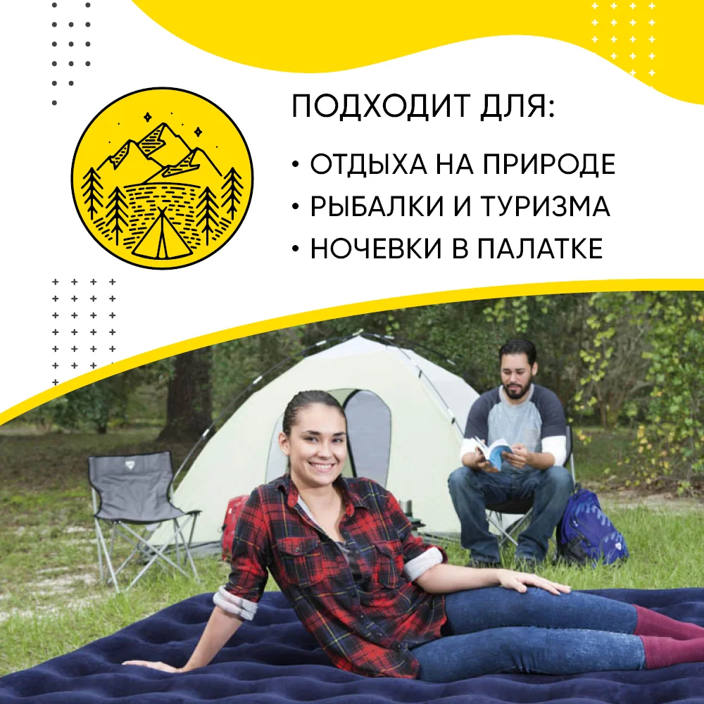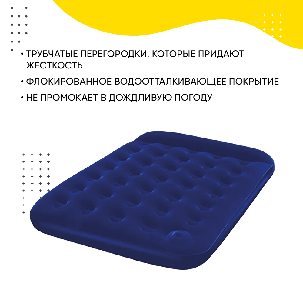 Надувная кровать всегда выручит вас в любой жизненной ситуации. Кровать удобно сдувать и надувать при помощи ножного насоса. Кровать имеет флокированное водоотталкивающее покрытие, что делает ее удобной в использовании и долговечной.