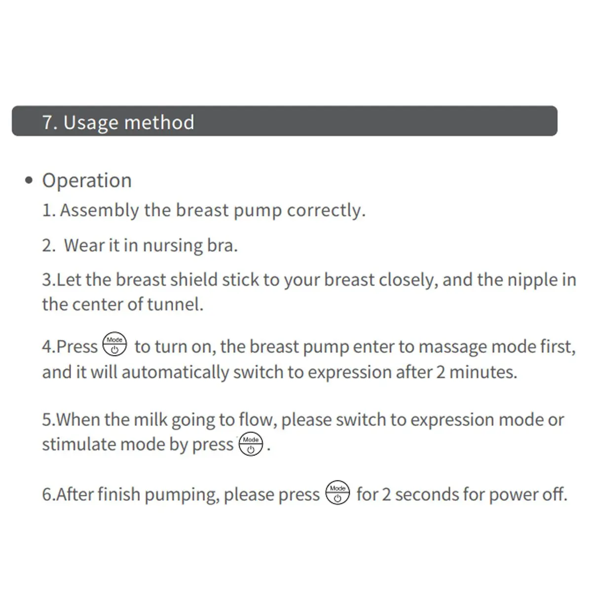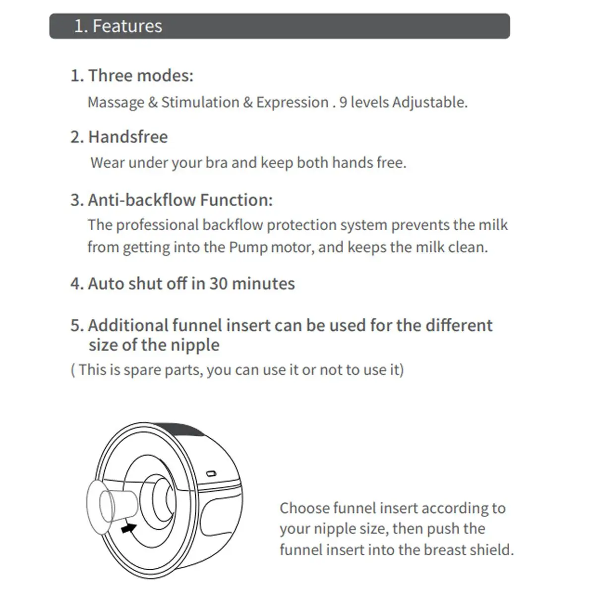 【 9 уровней всасывания и переключаемых 3 modes】с регулируемыми 9 уровнями и переключаемыми 3 режимами. Режим массажа поможет вам вытолкнуть молоко из молочных каналов и уменьшить дискомфорт груди. Чтобы помочь вам получить больше молока и дает Новой маме больше выбора и комфорта.
