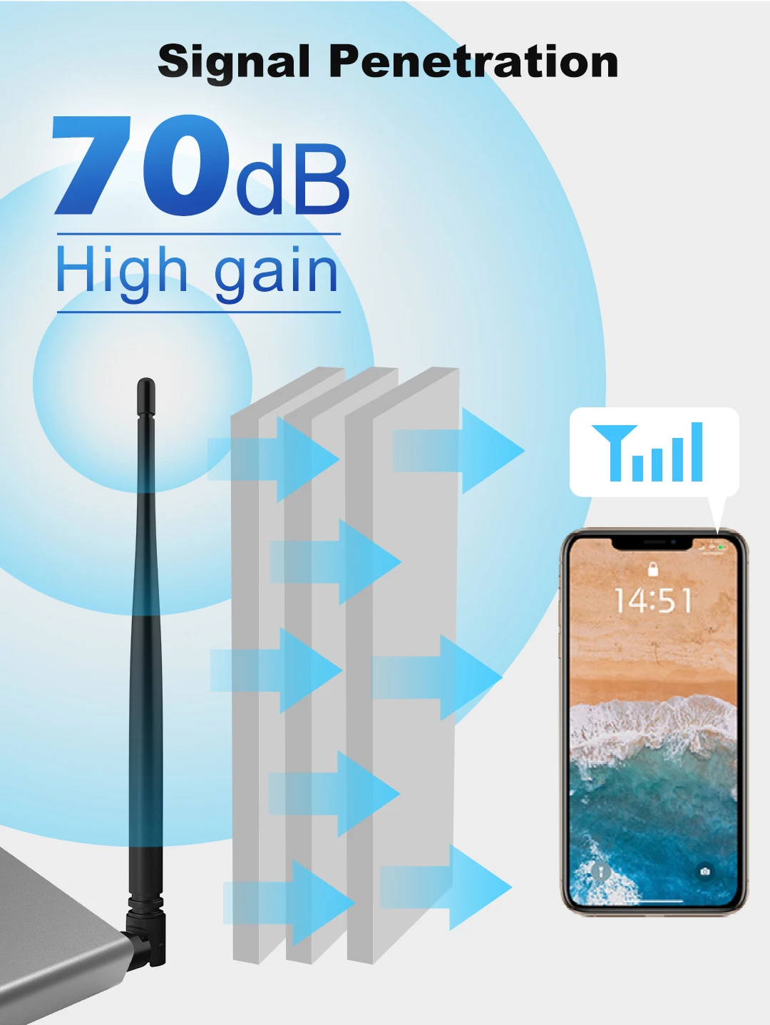 Используйте трубки усилителя мощности 70дБ с высоким коэффициентом усиления и 23dBm с высокой линейностью для улучшения линейности продукта и уменьшения помех базовым станциям.