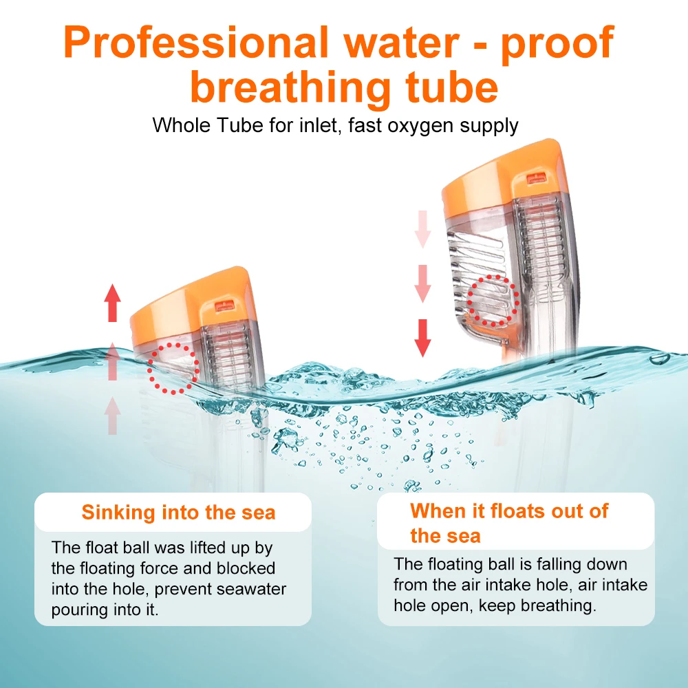 Дыхательная трубка принимает новейший дизайн плавающего шара, который может эффективно улучшить технологию сухой плавающей крыши. Вы можете использовать эту маску для дайвинга для нормального снорклинга или подключить к любому Дайвинг-оборудованию для глубокого дайвинга, чтобы вы могли наслаждаться прекрасным подводным миром.