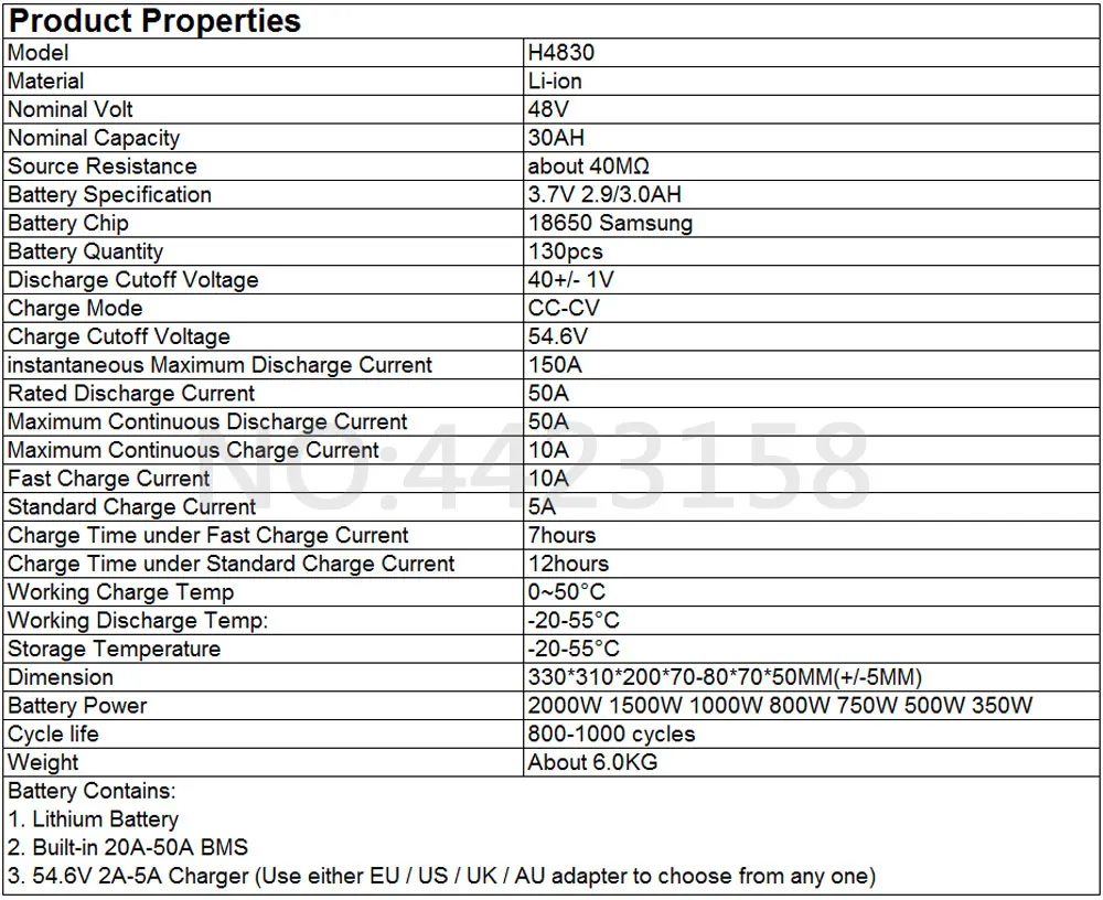Батарея подходящая мощность двигателя 250 Вт 350 Вт 450 Вт 500 Вт 650 Вт 750 Вт 800 Вт 1000 Вт 1500 Вт 2000 Вт 3000 Вт (пожалуйста, отметьте мощность двигателя перед покупкой. Спасибо!)36 В/48 В/52 в/60 в/72 В Аккумулятор для электрического велосипедаЛитий-ионная батарея для электровелосипеда, подходящий мотор-редуктор, бесщеточный двигатель постоянного тока и т. д.Подходит для мотора bafang, мотора Tongsheng, золотого мотора и т. д.Характеристики батареи электрического велосипеда:Номинальное напряжение: 36 В/48 В/52 в/60 в/72 В/Номинальная мощность: 21Ah-35Ah48V 21AH/22AH/26AH Размеры: 330*310*200*70-80*70*45 мм (разница: +/- 5 мм)48V 30AH/35AH/Размеры: 330*310*200*70-80*70*50 мм (разница: +/- 5 мм)52V21AH/26AH Размер: 330*310*200*70-80*80*50 мм (разница: +/- 5 мм)52 в 30AH Размер: 350*305*210*90*70-80*50 мм (разница: +/- 5 мм)Размер 52 в 35 Ач: 350*305*210*90*70-80*50 мм (разница: +/- 5 мм)Е-байка 36В 30AH/35AH/Размеры: 330*310*200*70-80*80*50 мм (разница: +/- 5 мм)60V 20/25AH Размеры: 330*310*200*70-80*80*50 мм (разница: +/- 5 мм)60 в 30 Ач Размер: 350*305*210*90*70-80*50 мм (разница: +/- 5 мм)72 в 18AH Размер: 350*305*210*90*70-80*50 мм (разница: +/- 5 мм)72V 20AH Размеры: 350*305*210*90*70-80*50 мм (разница: +/- 5 мм)72 в 25AH Размеры: 350*305*210*90*70-80*50 мм (разница: +/- 5 мм)Ячейки: Мощный 18650 2600 мАч 2500 мАч Samsung 2600 мАч 2900 мАч 3500 мАчBMS: 20A-50 Ампер непрерывный 50 ± 10 ампер максимумПодходящий Двигатель: 48 В/52 в/60 в/72 в 150 Вт 200 Вт 250 Вт 300 Вт 400 Вт 500 Вт 650 Вт 750 Вт 800 Вт 1000 Вт 1500 Вт 1800 Вт 2000 Вт 3000 ВтТок зарядки: 2-5AНапряжение отключения заряда: 64,6 в/58,8 в/67,2 в/84 в/Напряжение отключения разряда: 40 В/41 В/50 В/Температура разряда: от-20 до 65 °CТемпература зарядки: от 0 до 65 °CСрок службы: ≥ 80% емкости после 800 циклов.