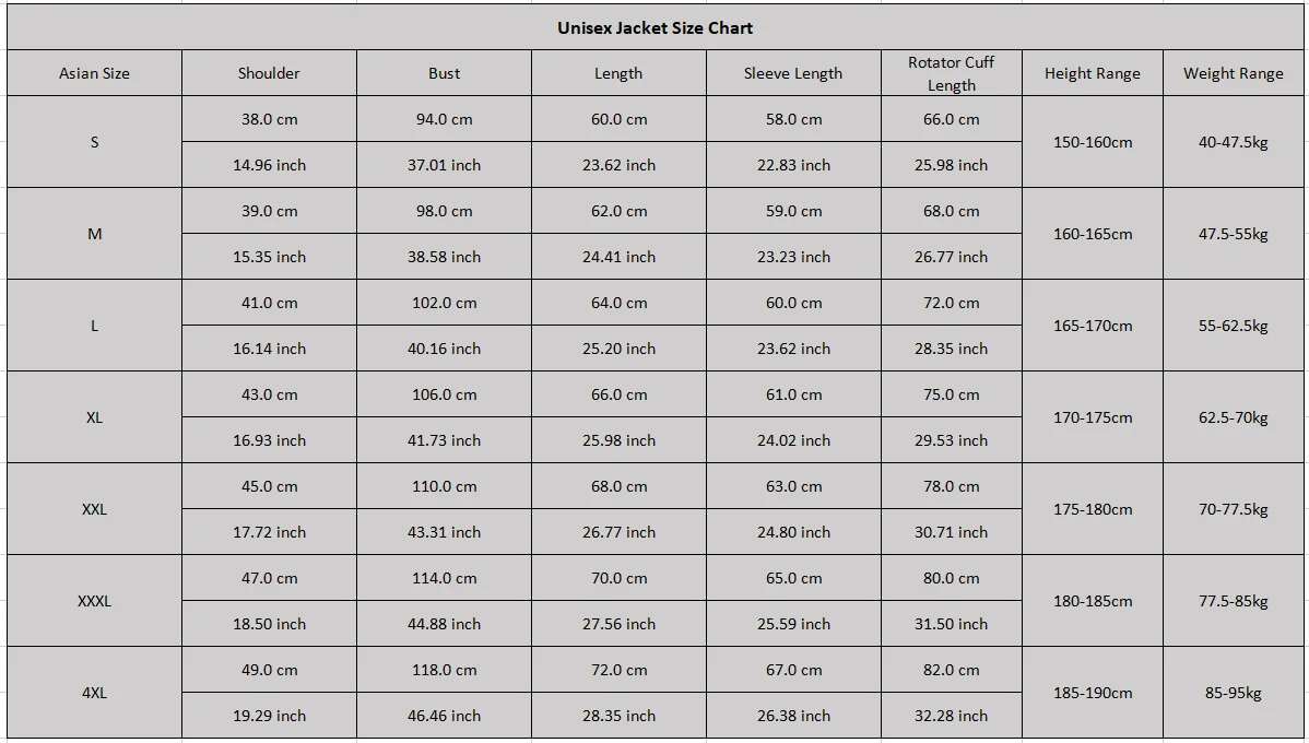 Куртка унисекс (для мужчин и женщин): S-4XL, подходит для роста 150-190 см, вес 40-95 кг;