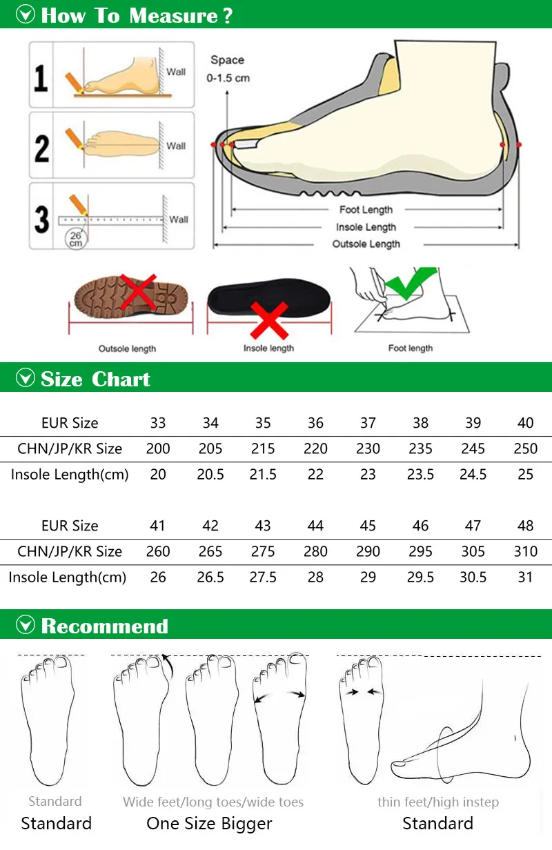 Пожалуйста, выберите размер обуви в соответствии с длиной стельки, и вам нужно улетать, запасом 0,5 ~ 1 см, чтобы удовлетворить вашим ногам комфорт.