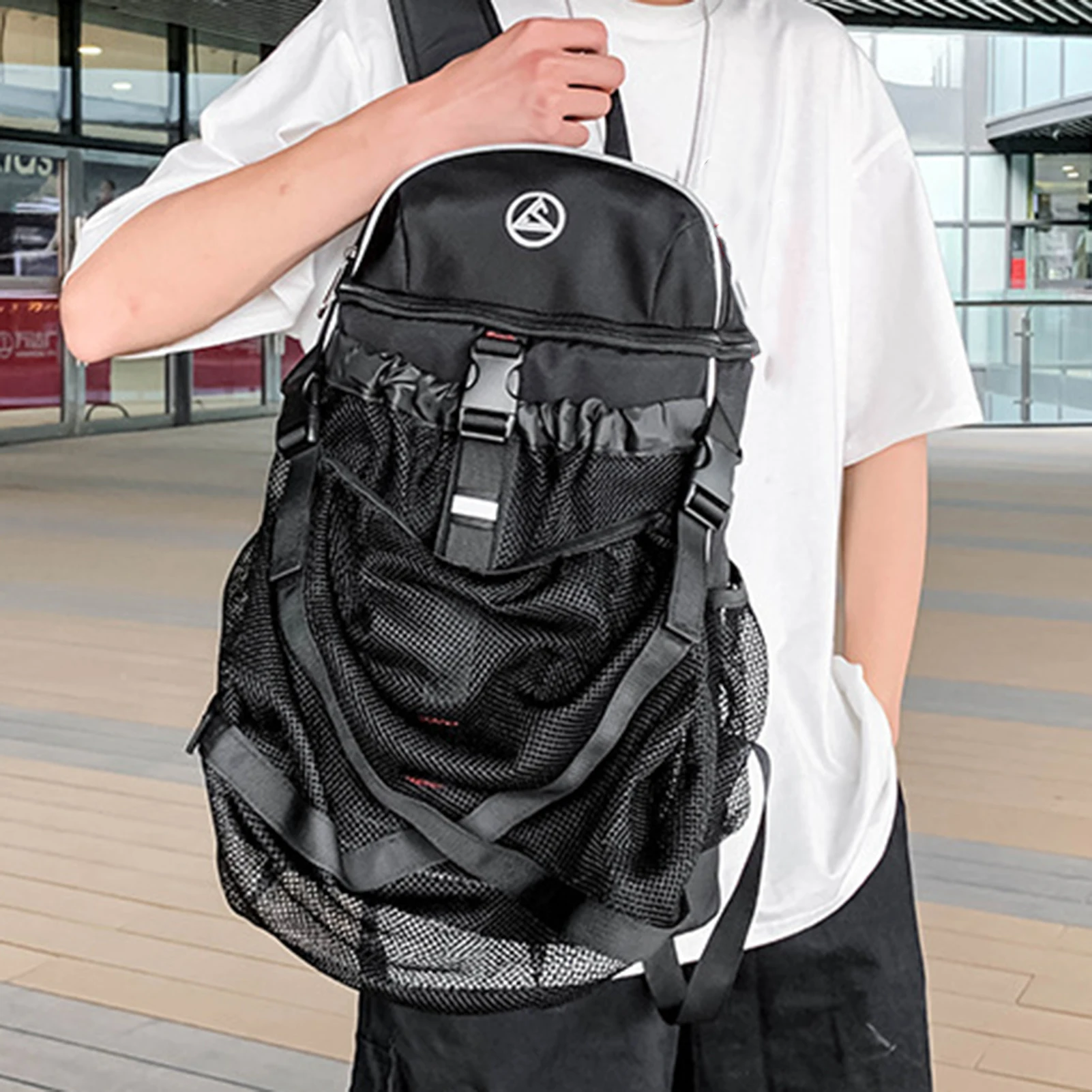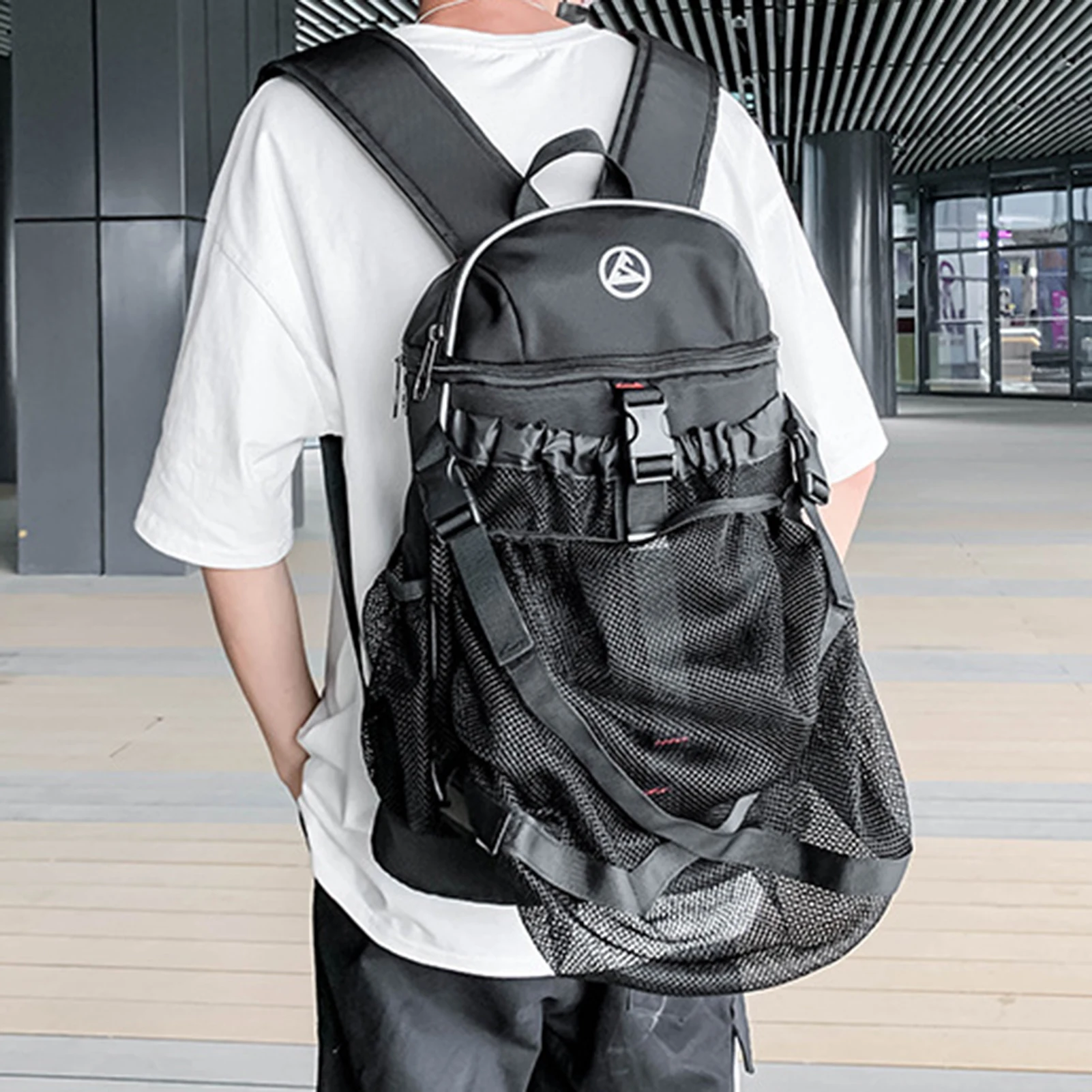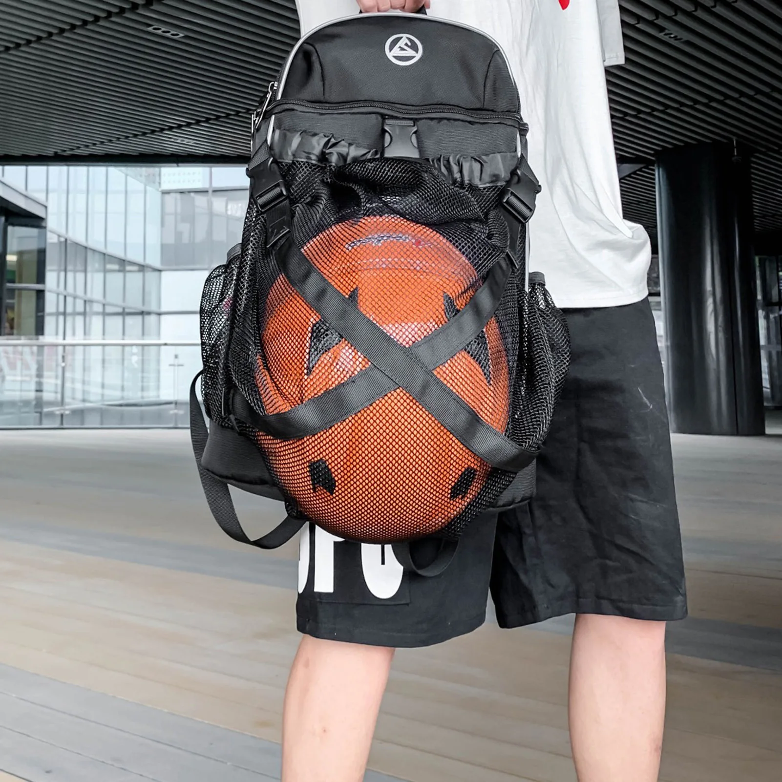 1. Дизайн баскетбольного рюкзака: водонепроницаемый защитный рюкзак на шнурке. Сетчатая Сумка фиксируется на рюкзаке с 2 кнопками.