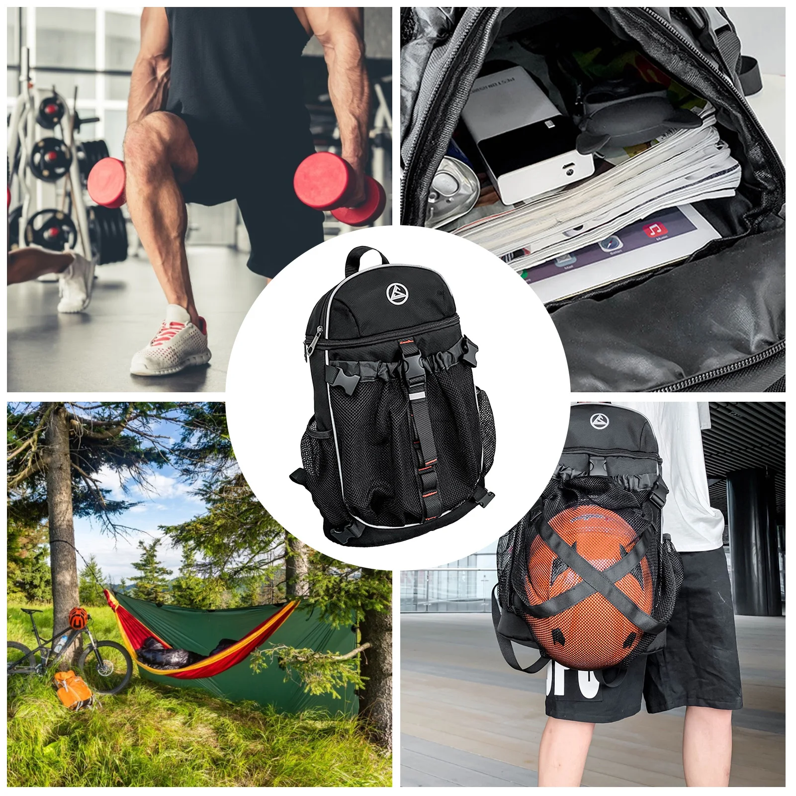 4. Спортивное оборудование: рюкзак может держать некоторые портативные электронные продукты и различное маленькое спортивное оборудование, такие как эластичные ленты, захваты, абдоминальные колеса и т. д. Сетчатый мешок может держать различные шары, такие как баскетбол, футбол и т. Д.