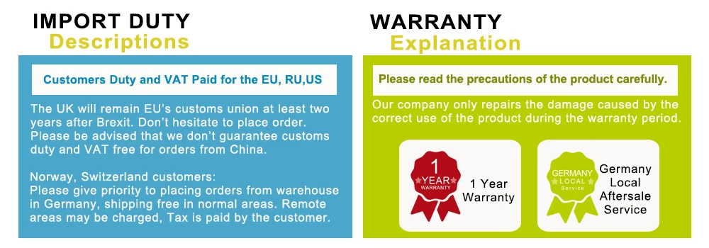 1 год гарантии, местный послепродажный сервис в Германии. Наша компания восстанавливает повреждения, вызванные правильным использованием продукта в течение гарантийного срока. Пожалуйста, внимательно прочитайте меры предосторожности продукта.