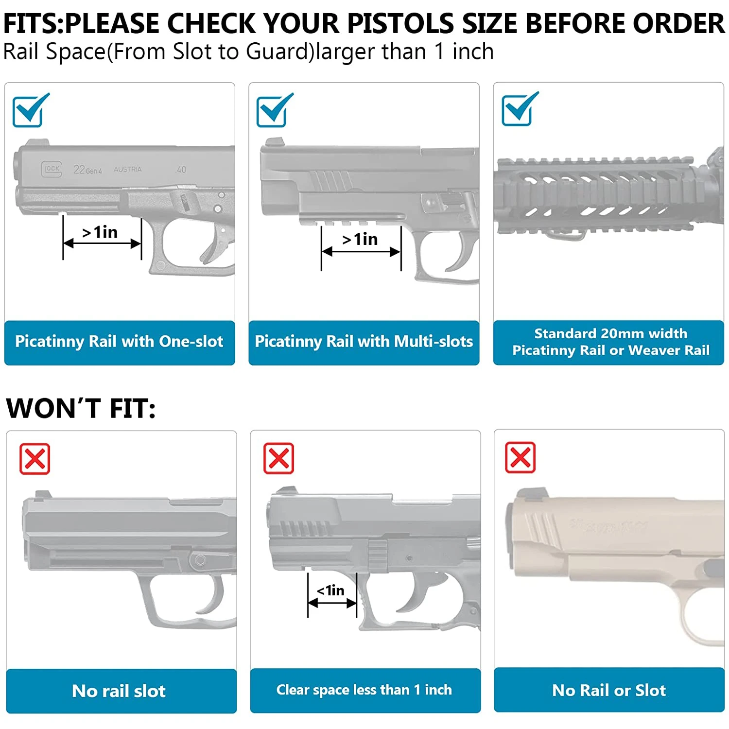 4. На регулируемом креплении есть 2 винтовых отверстия, выберите один из них, чтобы соответствовать рельсу вашего пистолета и используйте винт (который уже установлен на комбо) чтобы закрепить устройство на рельсе. Чтобы использовать этот продукт, Ваш пистолет должен иметь Рельс Пикатинни со слотом.