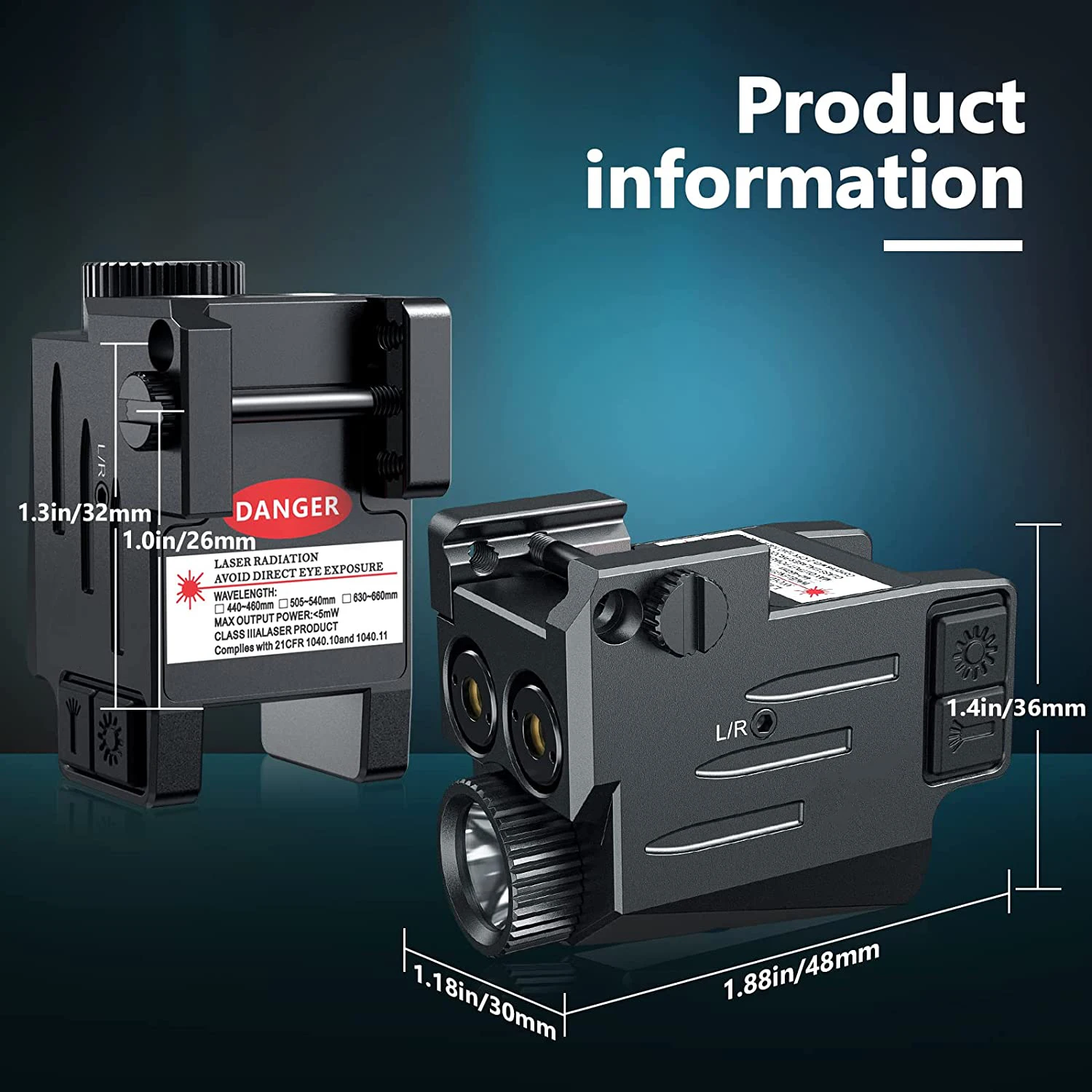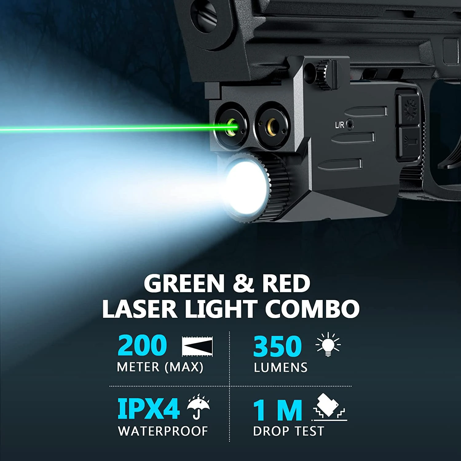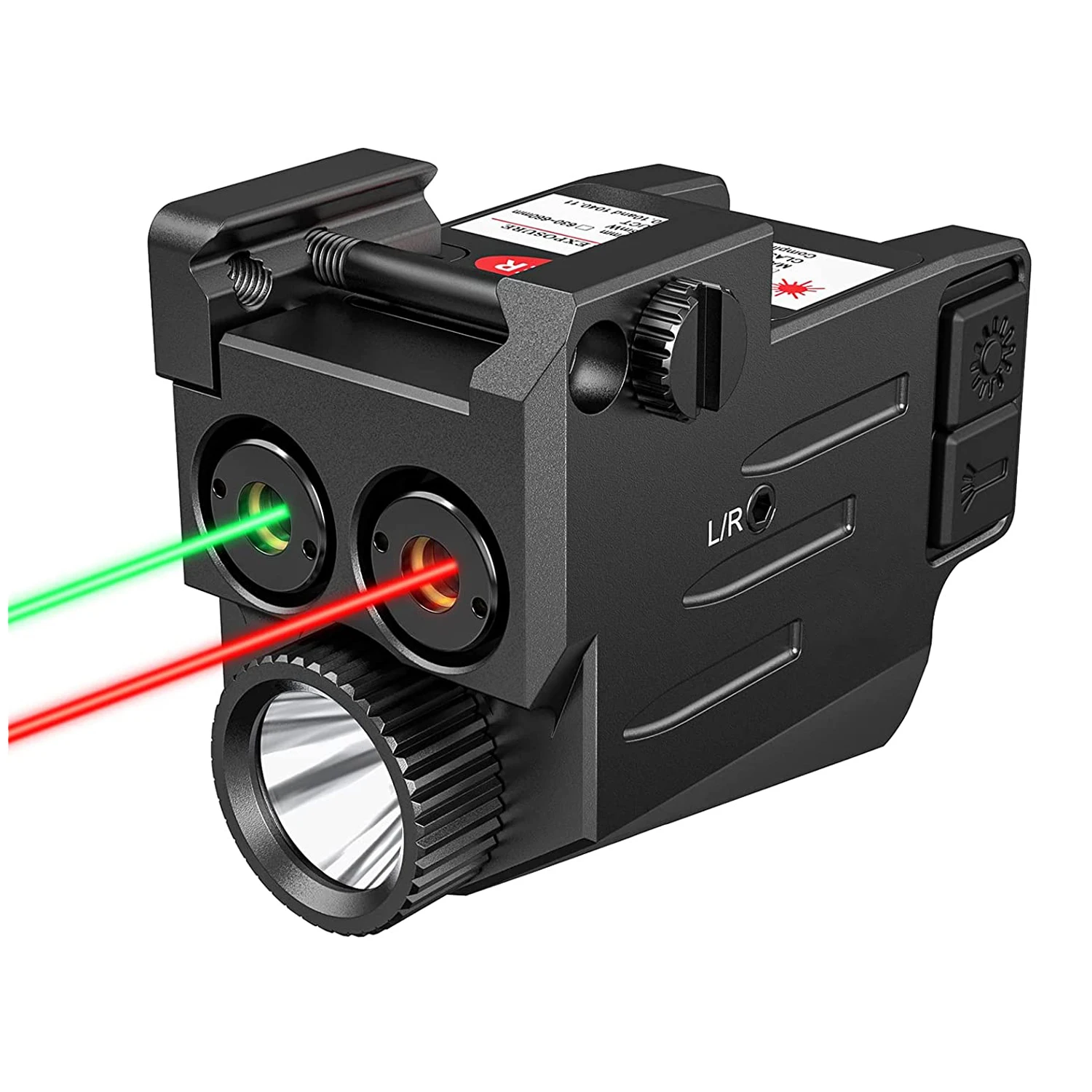 2. Зеленый и красный лазерный светодиодный светильник комбо изготовлен из алюминия, что делает его гораздо более прочным, чем те, которые изготовлены из пластика. Светодиодный фонарик и лазерный прицел питаются от встроенной аккумуляторной батареи и есть светодиодный индикатор, показывающий состояние батареи.