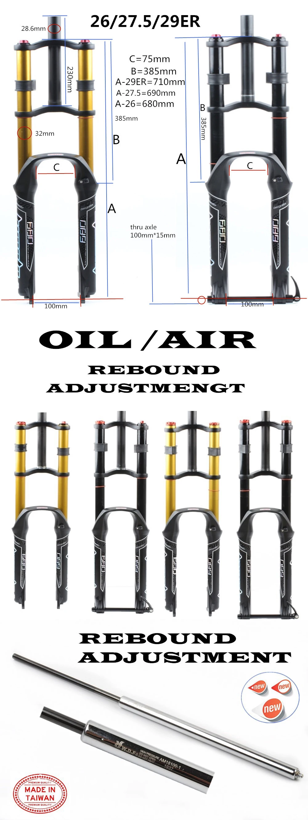 La horquilla de hombro doble tiene el 26/27.5/29ER, tiene resorte de aceite y horquilla de aire. Esta horquilla admite neumaticos de 2,3 pulgadas. 26/27.5/29ER horquilla la imagen C es de 75 мм, la B es de 385 мм.