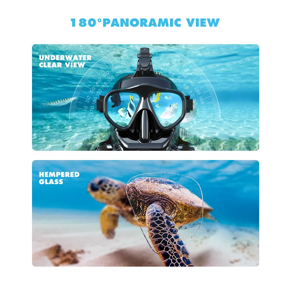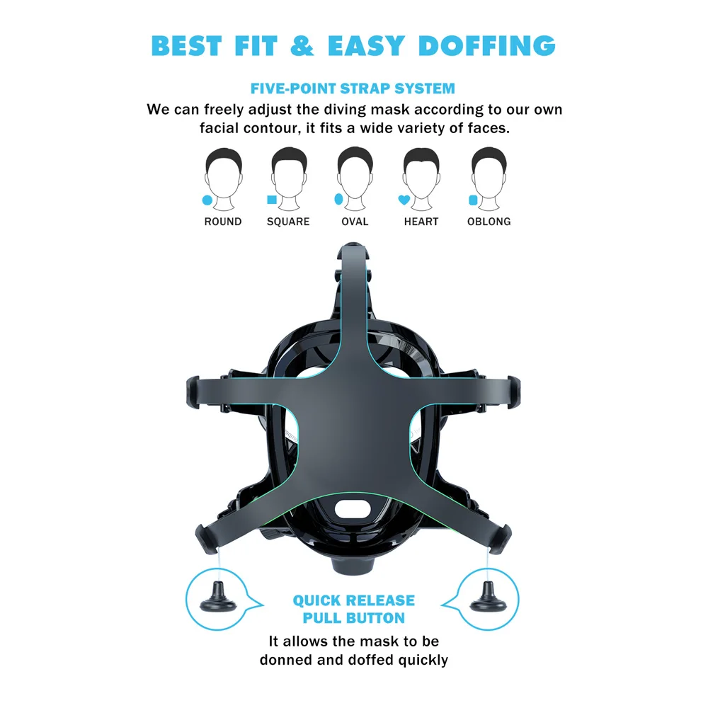В анфас маска для подводного плавания обеспечивает отличную посадку по фигуре, Благодаря регулируемому 5-ти точечные голова жгут. Мы можем свободно регулировать ремешок в соответствии с нашими контурами лица. В то же время быстрый высвобождение может помочь нам быстро снять маску для дайвинга.