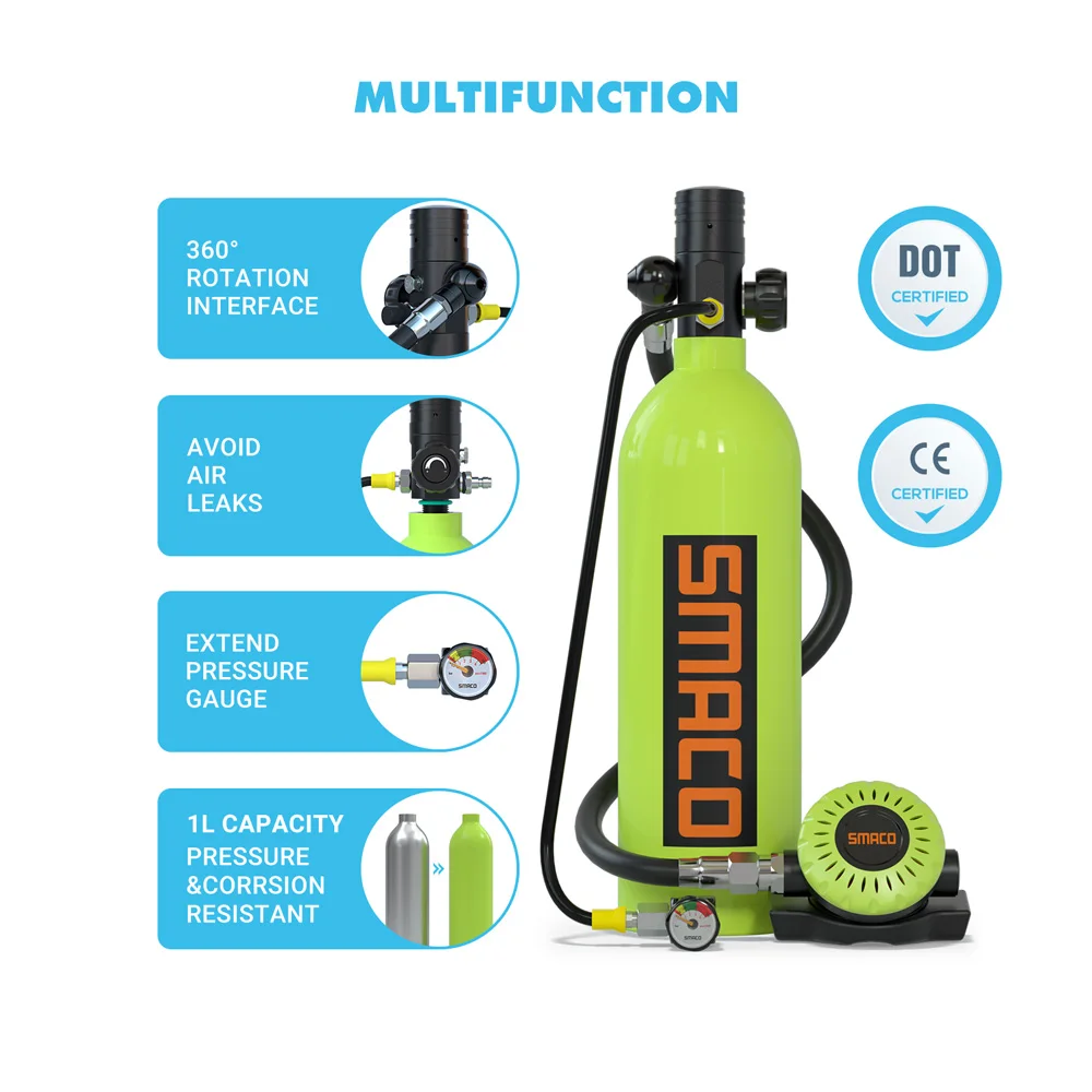 Комбинация M8058 full face mask и S400 Pro scuba tank идеально подходит для дайвинга или изучения вредителей и пещер. Заполнение резервуара для дайвинга S400 Pro 1L с помощью воздушного компрессора занимает всего около 26 минут. Это позволяет дышать под водой в течение 15-20 минут. Он также оснащен креплением для камеры. Вы можете легко прикрепить камеру, чтобы запечатлеть удивительный момент.