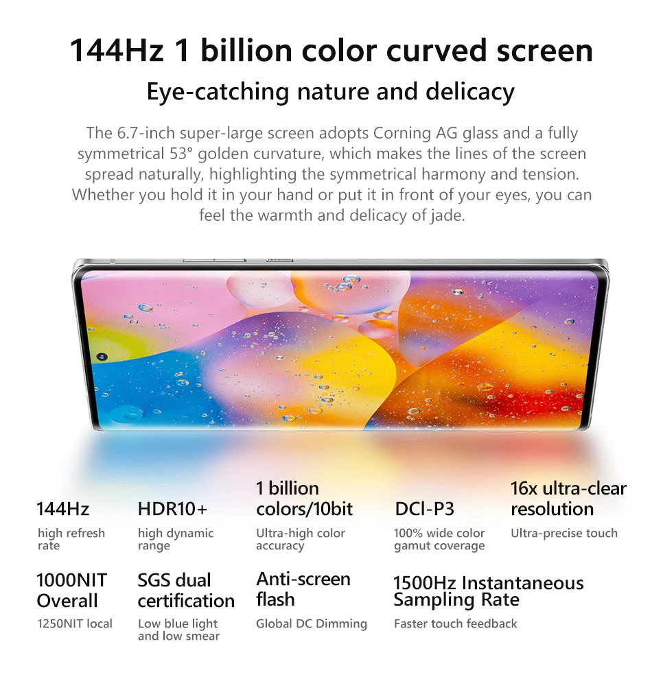 *Экран: 6,7 ''FHD + безрамочный экран 144 Гц изогнутый Экран; Разрешение: 2400*1080P