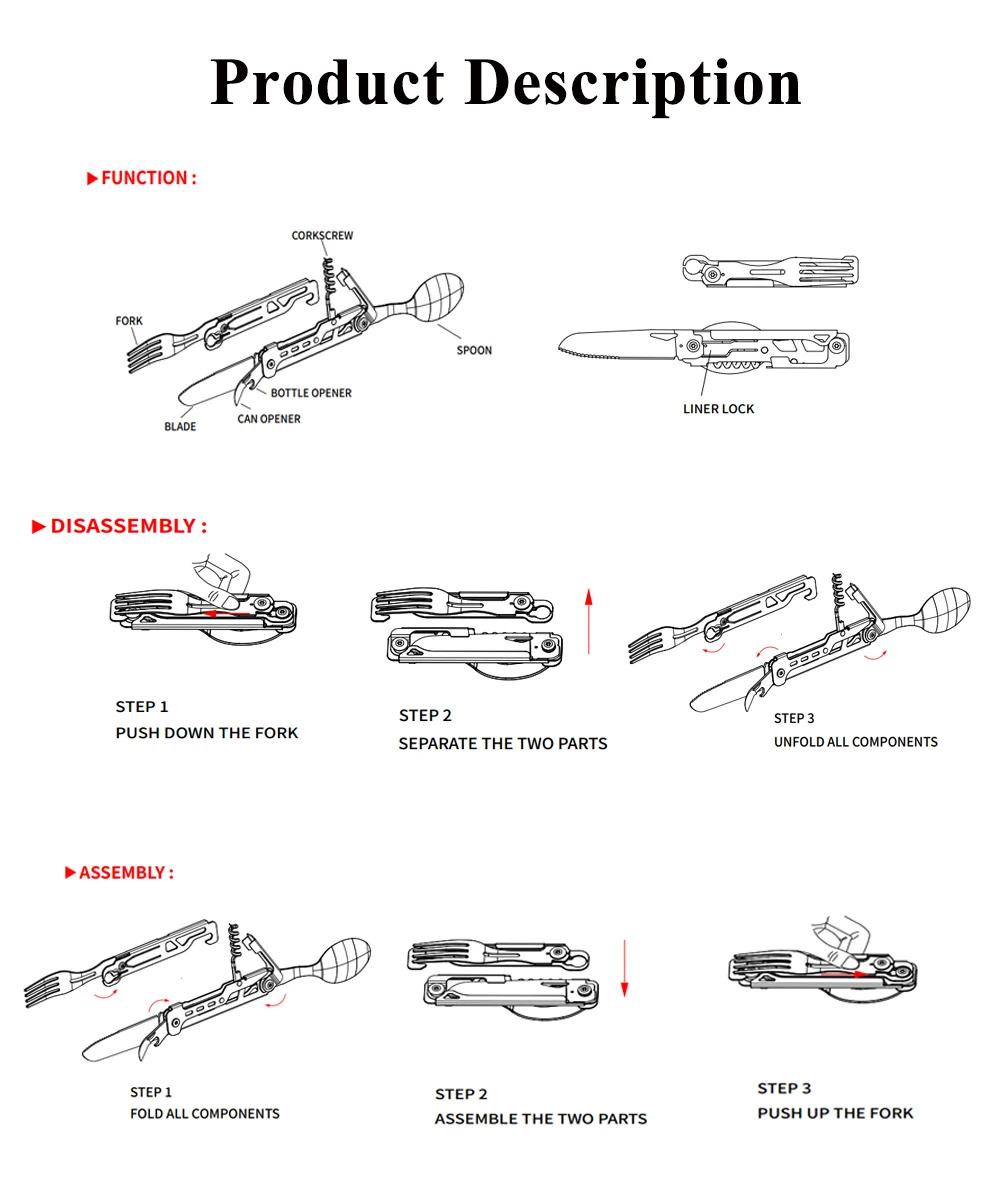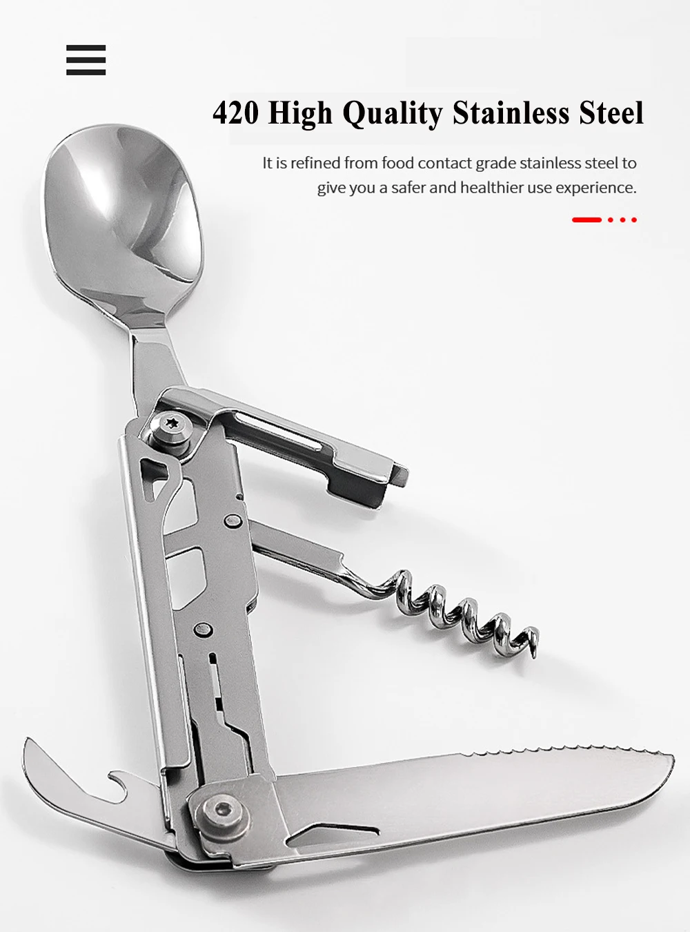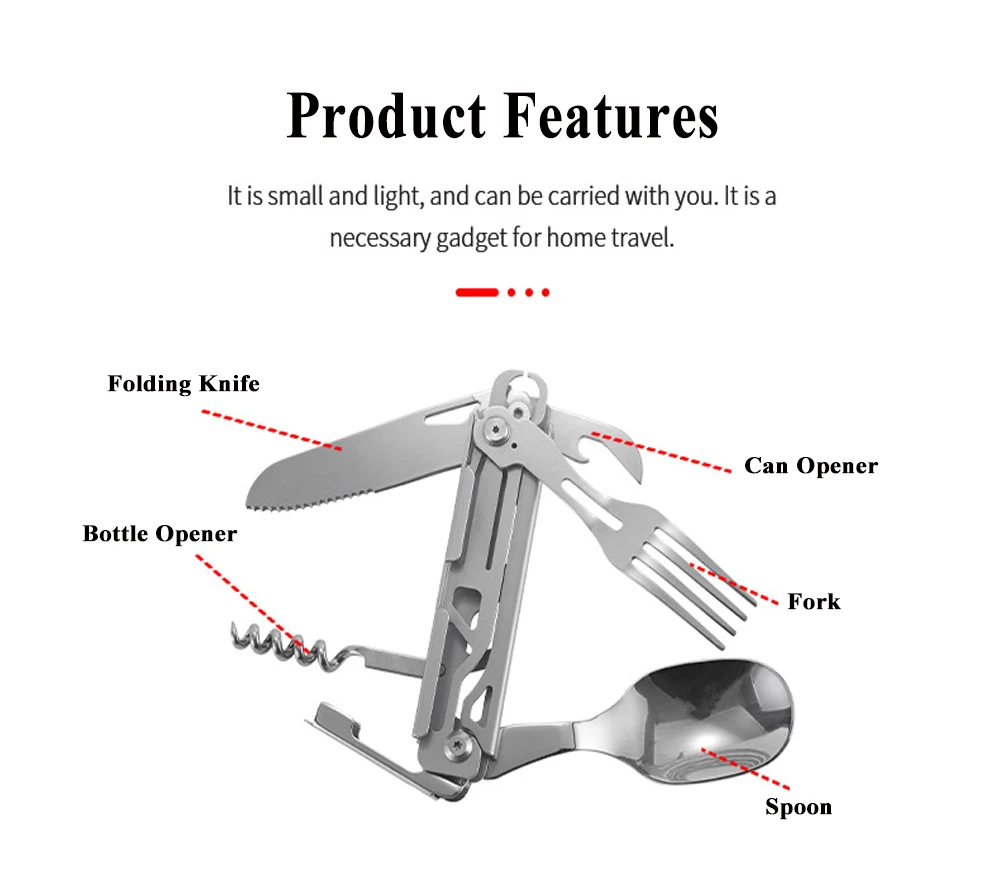 420 Складной нож из нержавеющей стали Многофункциональная портативная вилка ложка съемные ручные инструменты для выживания на открытом воздухе походные столовые приборы Посылка включает в себя: 1 * мультиинструмент Особенности: 1.100% Абсолютно Новый и высококачественный. 2. Красиво и хорошо работает. Размер маленький и практичный, легкий. 3. Очень крутой нож, милый, новый, Мини размер, вы можете взять его с собой, это незаменимый гаджет для использования на открытом воздухе и в помещении. 4. Всегда готовы: Идеально подходит для всех случаев; Вы можете использовать его для кемпинга, пеших прогулок, охоты и любых видов активного отдыха. 5. Подходит для мужских подарков, коллекционеров, друзей и т. д. Примечания: 1. Пожалуйста, учитывайте разницу в 1-3 мм из-за ручного измерения, спасибо за понимание! 2. Из-за разницы между различными мониторами, пожалуйста, поймите, что изображение может не отражать фактический цвет товара.