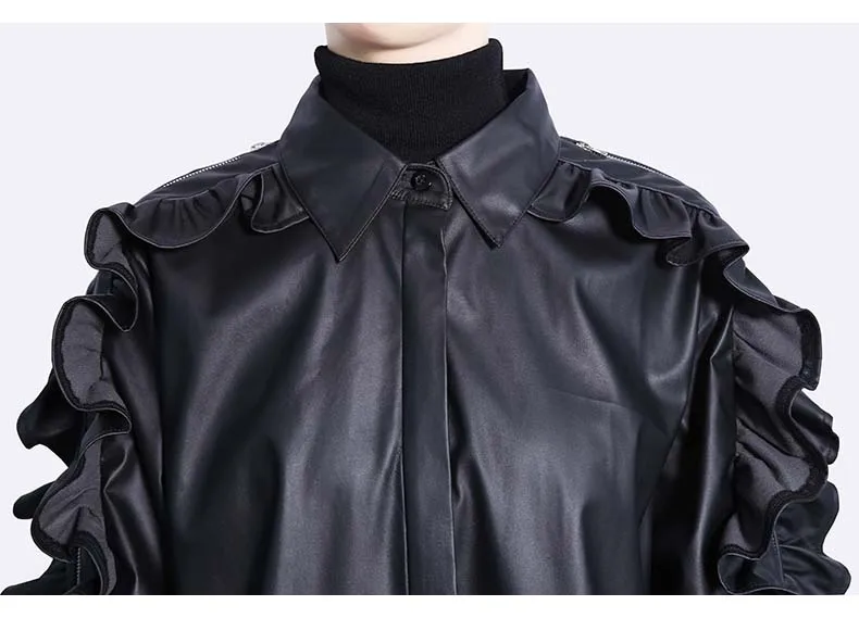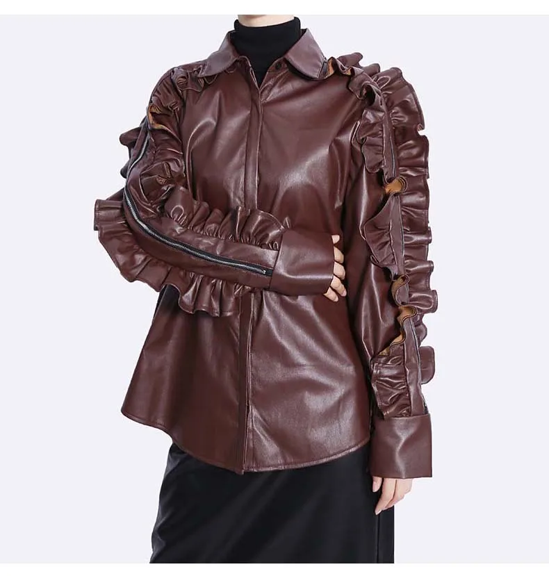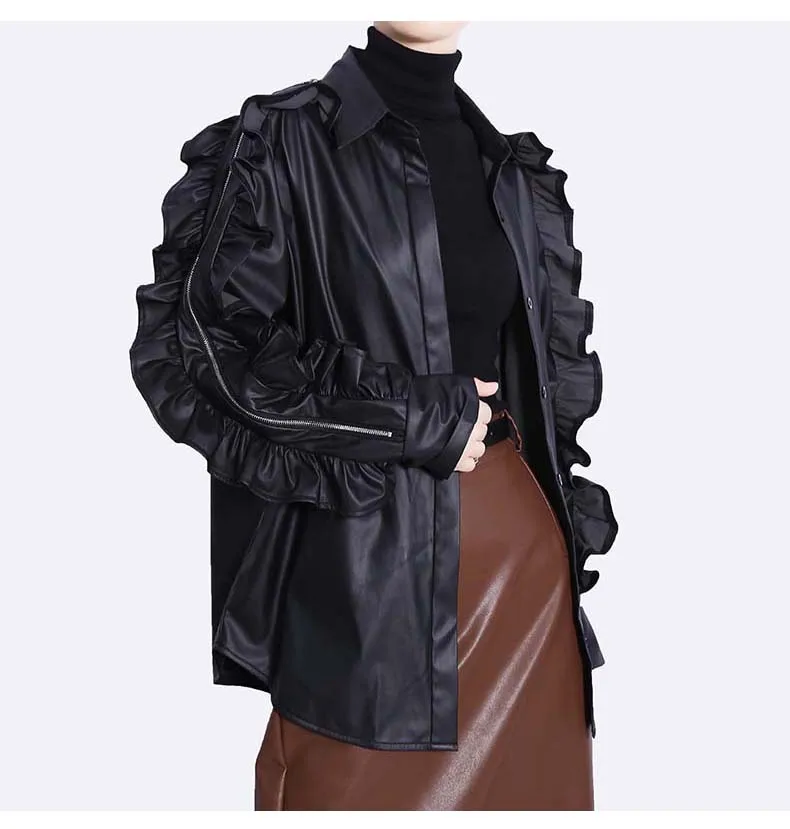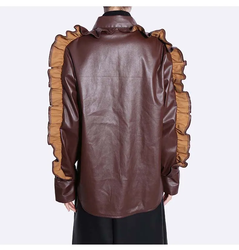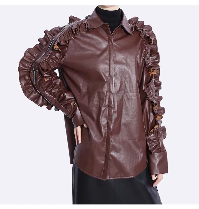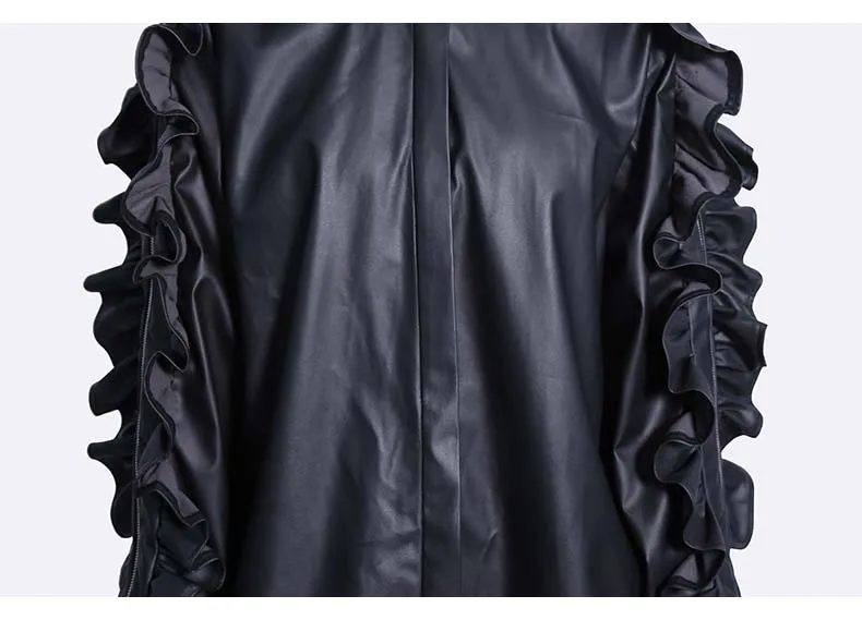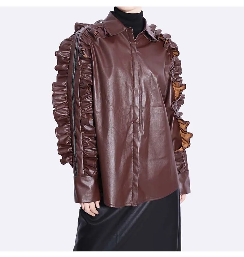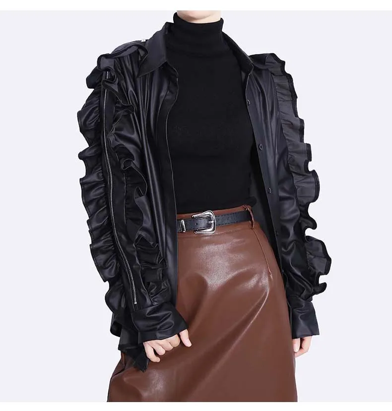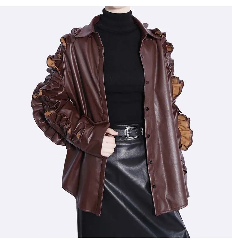 Сплошной цвет черный коричневый новый 2022 зима искусственная кожа женские на пуговицах куртка пальто с оборками на рукавах уникальный стиль