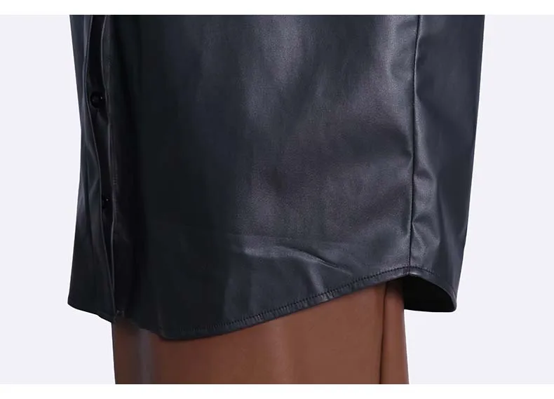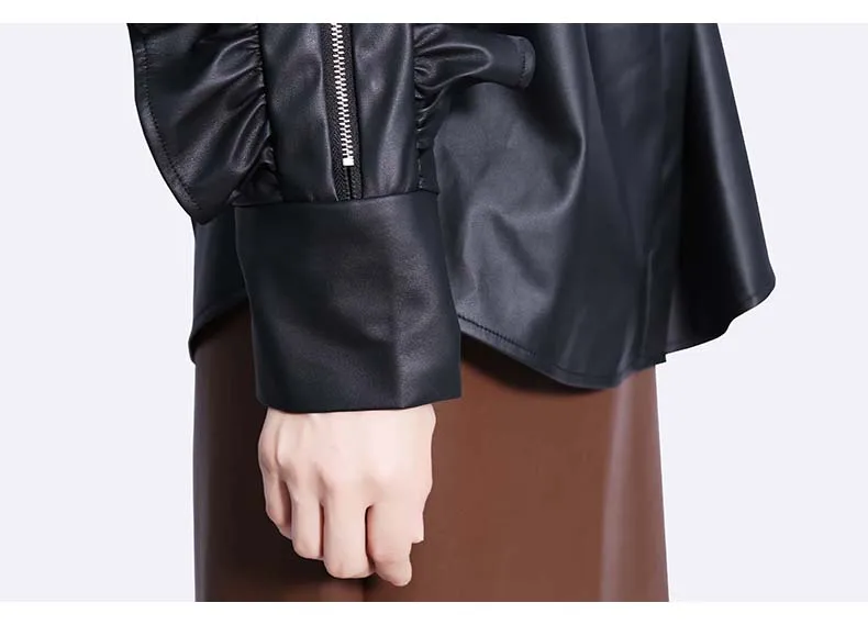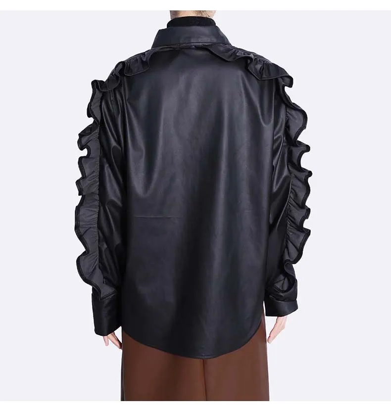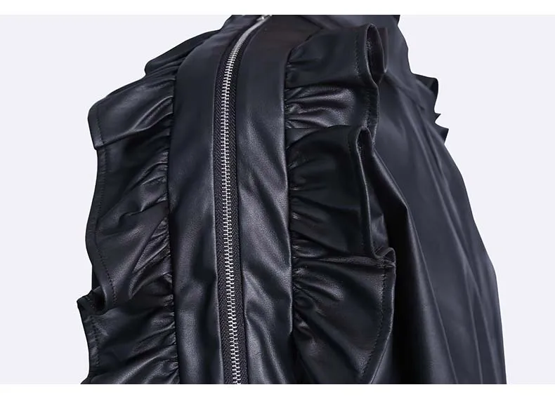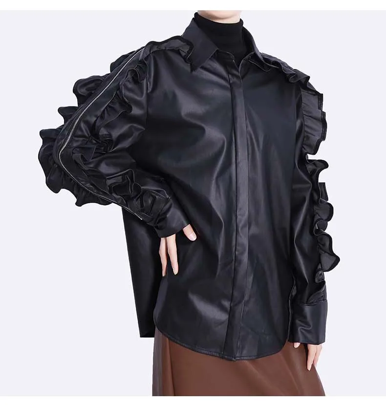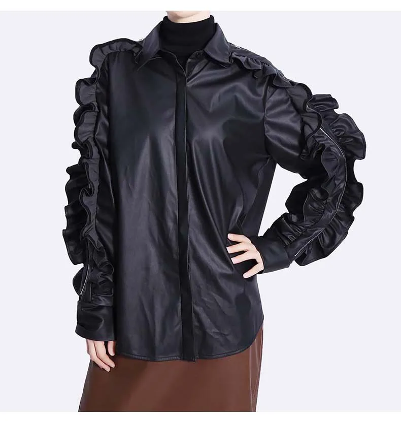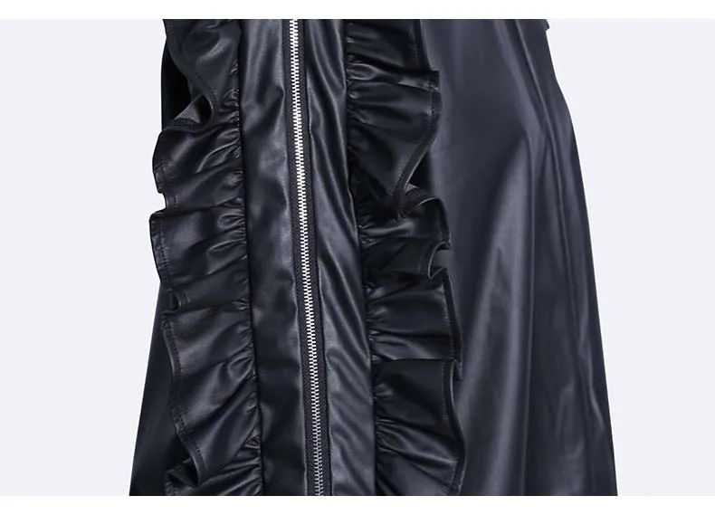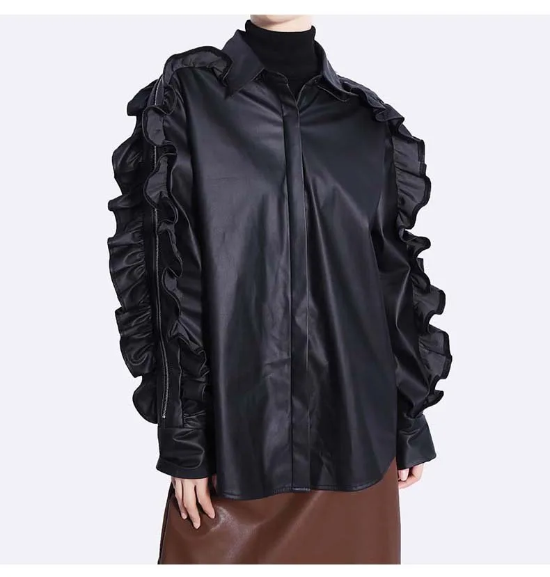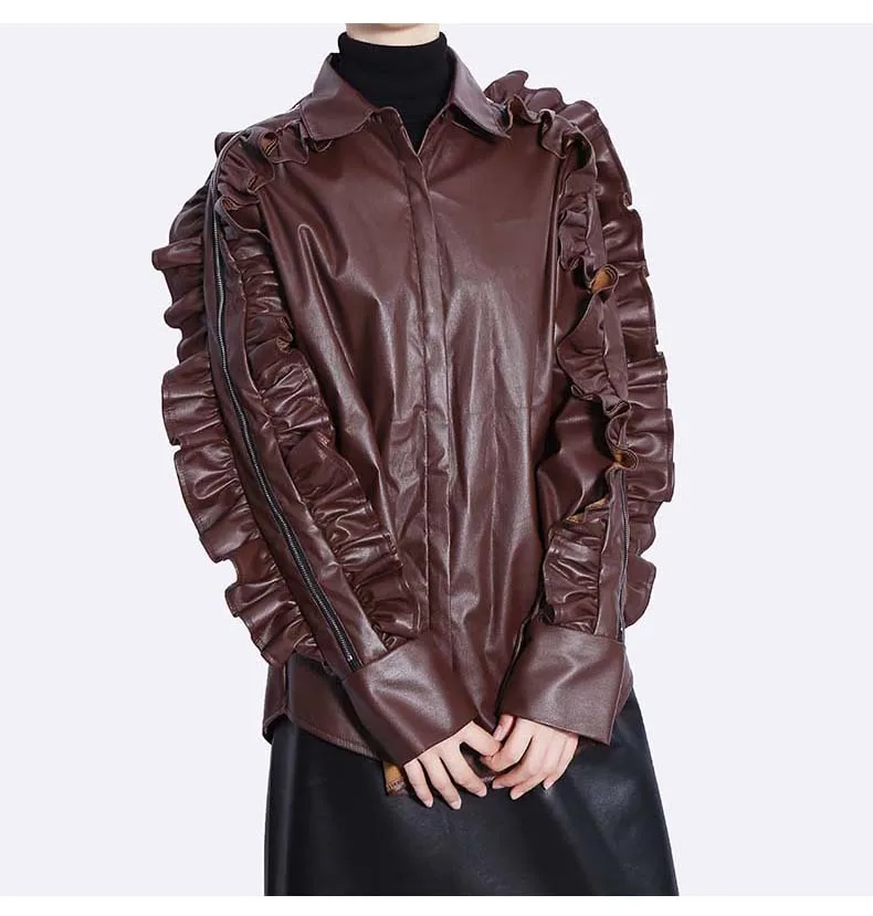 Сплошной цвет черный коричневый новый 2022 зима искусственная кожа женские на пуговицах куртка пальто с оборками на рукавах уникальный стиль