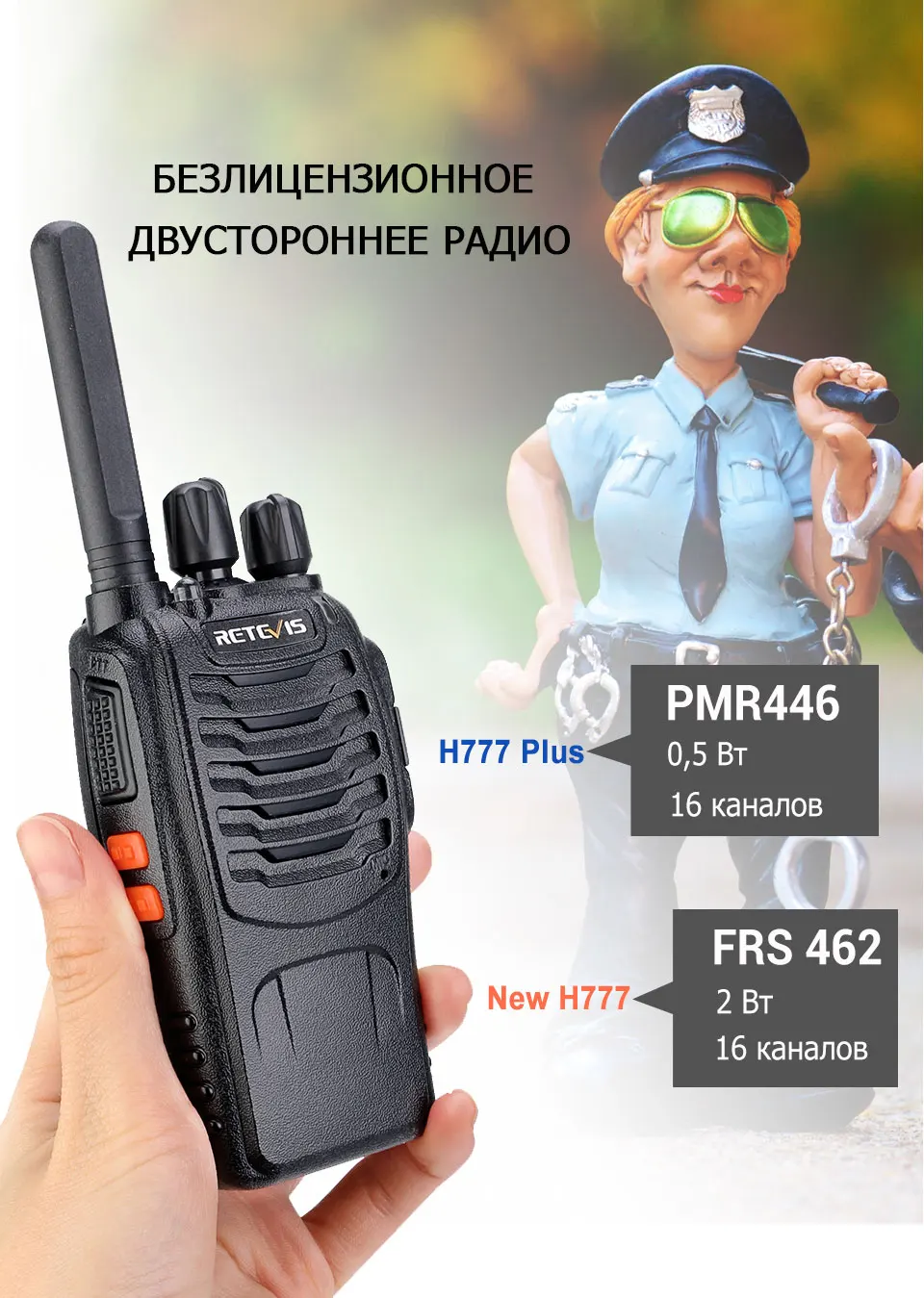 Никаких юридических проблем и дополнительных сборов за использование частот. Версия PMR H777 plus не требует лицензирования для Европы, версия FRS H777 предназначена для США и Канады.