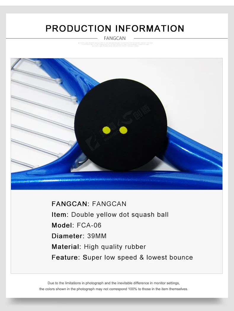 -Тип: двойной желтая точка сквош мяч -Вес: 25 г каждая штука -Диаметр: 39 мм -Материал: экологически чистый каучук -Упаковка: упаковка Bluk -Уровень: турнир