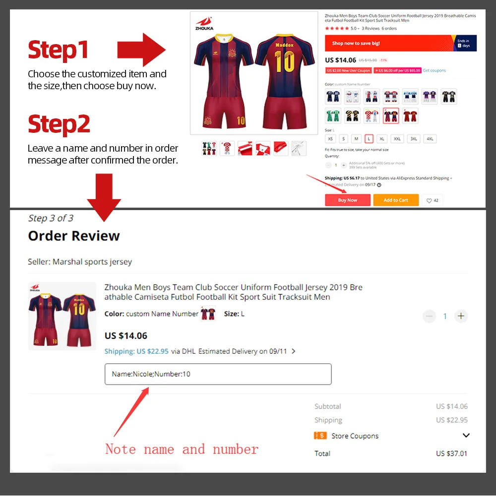 Пожалуйста, укажите имя и номер вашего выбора в примечании с вашим заказом. Конкретная операция является следующей, если нет заметок или сообщения, мы отправим Джерси, как на картинке!