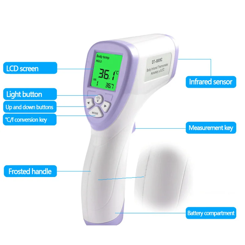 1. temperature units for conversion: Fahrenheit or Celsius, long press "MODE" more than 5 s. 2.Body temperature measurement: directed to the forehead with a distance of 1-15 cm. 3.Automatic selection range and display resolution 0.1 ° C / 0.1 ° F. 4.Automatic data hold function and auto power off function. 5.Memorize the last 32 groups of measurement data. 6.Measuring range: body temperature measurement 32 ℃ -42.9 ℃ 7.Measurement time: 0.5s 8.Measuring method: non-contact measurement 9.Temperature unit: ° C / ° F 10.Measurement accuracy: error value ± 0.2% ℃ 11.Automatic shutdown: within 20 seconds 12.Power supply: battery 13.Color: blue, purple, green (optional) Package Include: 1 pc * Digital Themometer